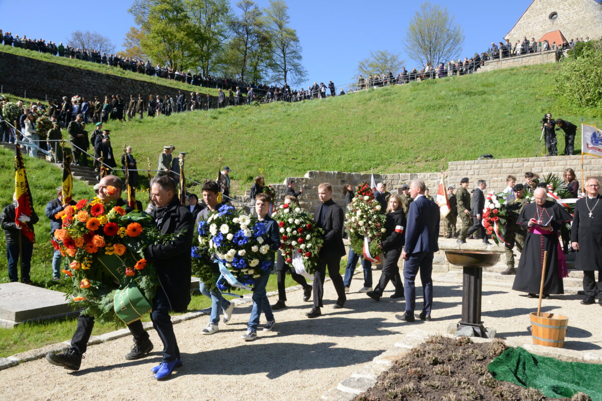 Nach den Ansprachen trugen Jugendliche die Trauerkränze zu den im Boden eingelassen Gedenktafeln im „Tal des Todes“. Vor den Kranzniederlegungen fand die feierliche Beisetzung sterblicher Überreste ehemaliger Häftlinge mit interreligiösem Segen statt.