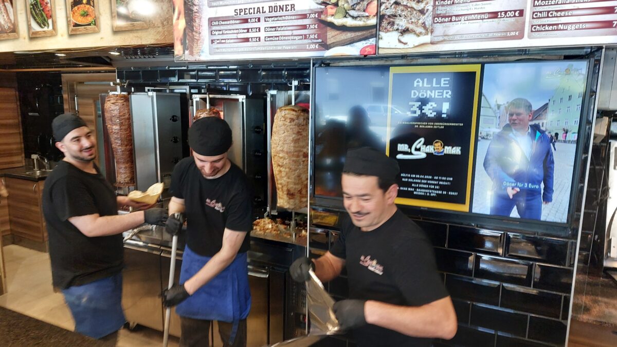In der Bahnhofsstraße/Ecke Auenstraße ging am Donnerstag nichts mehr ohne Anstehen. Vor dem Dönerladen „Mr. Shak Mak“ schlängelte sich eine lange Schlange. Die war geduldig, hungrig und trotzdem gut gelaunt. Der Grund: Ein Wahlversprechen des neuen Oberbürgermeisters Benjamin Zeitler wurde eingelöst: Es gab Döner für drei Euro.