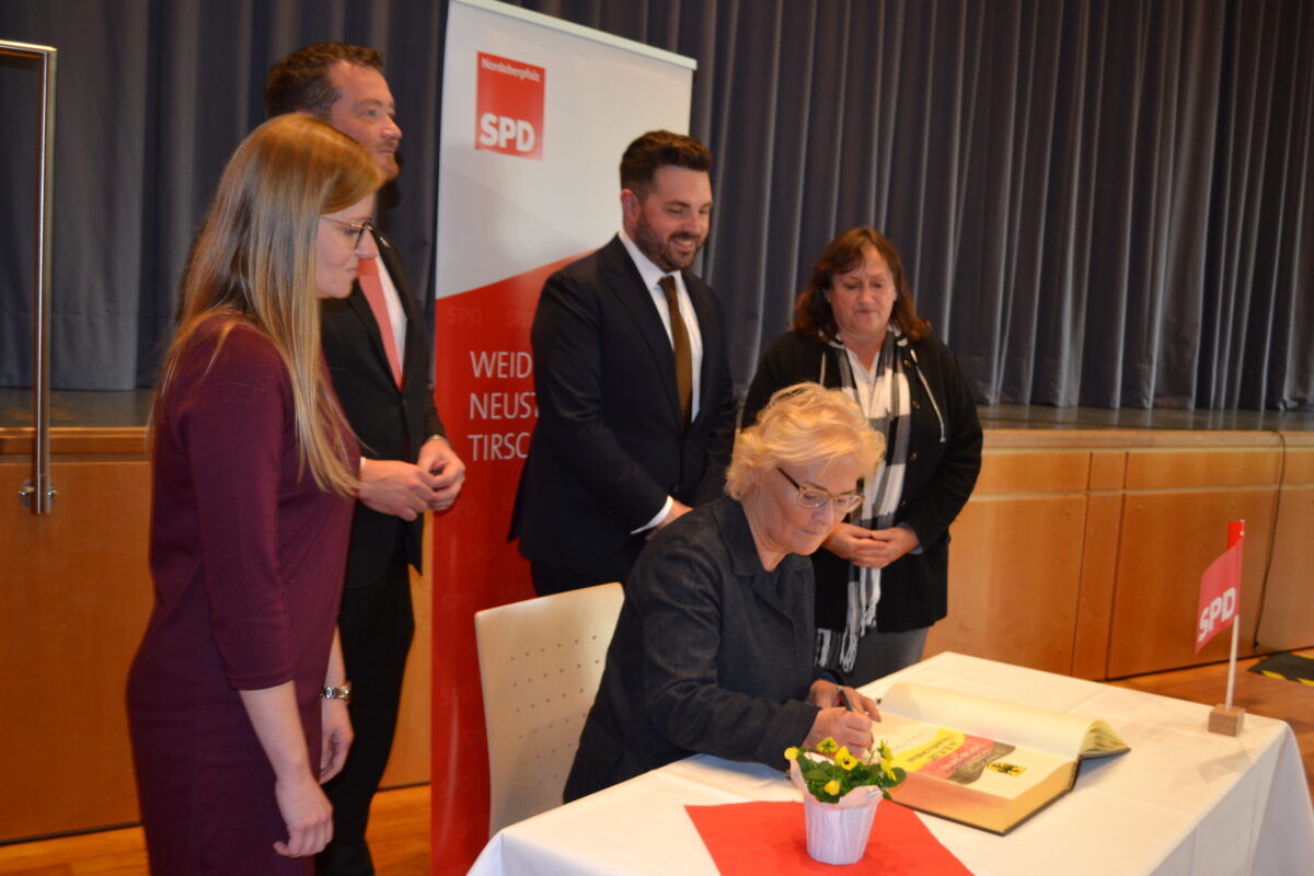 Es ist sozusagen ein Heimspiel für Verteidigungsministerin Christine Lambrecht. Zunächst der Rundgang durch die KZ-Gedenkstätte Flossenbürg, wo sie mit ihrem Fraktionskollegen Uli Grötsch und der SPD-Kreisvorsitzenden Nicole Bäumler einen Kranz am SPD-Gedenkstein niederlegte (siehe auch: https://redaktion.oberpfalzecho.de/beitrag/verteidigungsministerin-christine-lamprecht-sieht-abgrund-des-menschlichen-und-moralischen), dann der Auftritt beim SPD-Jahresempfang in der Stadthalle, wo sie von den circa 160 Sozialdemokratinnen und Sozialdemokraten mit Standing Ovations begrüßt wurde. Das bereitete der in Mannheim geborenen und aufgewachsenen 57-Jährigen nach dem offensichtlich an die Nieren gehenden Gang durch das ehemalige KZ viel Freude: “Besuche an der Basis machen mir immer Riesenspaß”, ruft sie den Besuchern zu und lobt den SPD-Kreisverband mit Nicole Bäumler an der Spitze für die eindrucksvolle Veranstaltung. “Über 150 Leute an einem Freitagnachmittag. Das ist großartig.”