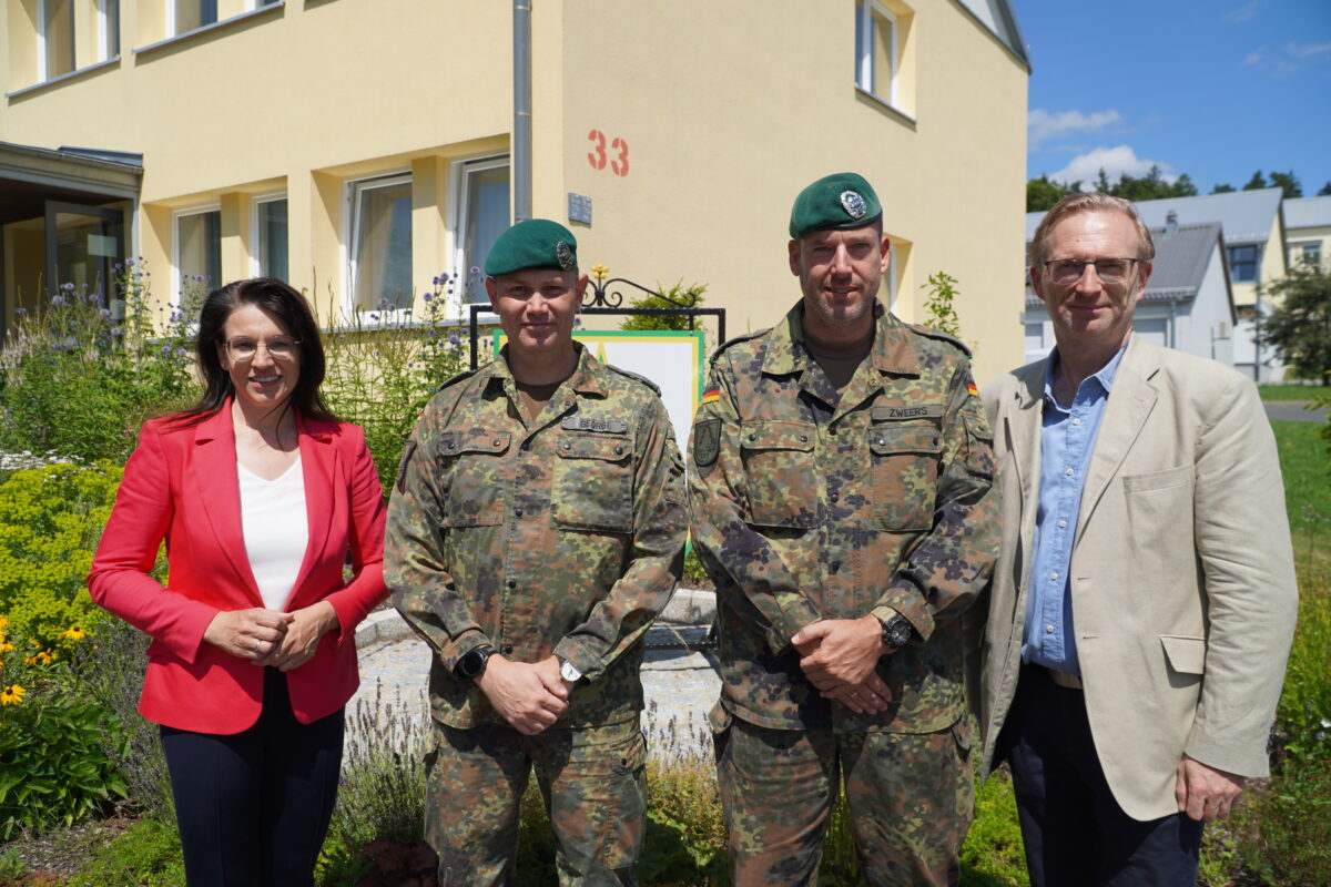 Bei einem kürzlich erfolgten Ortsbesuch in der Oberviechtacher Grenzlandkaserne tauschten sich die Bundestagsabgeordnete Martina Englhardt-Kopf und der Landtagsabgeordnete Alexander Flierl (beide CSU) über aktuelle Entwicklungen und Herausforderungen mit den dort stationierten Militärvertretern aus. Im Vordergrund standen Themen wie die dauerhafte Verlegung des Panzergrenadierbataillons 122 nach Litauen, welches als Reaktion auf den Angriffskrieg Russlands gegen die Ukraine beschlossen wurde, sowie die Sicherung des Bundeswehrstandortes in Oberviechtach.