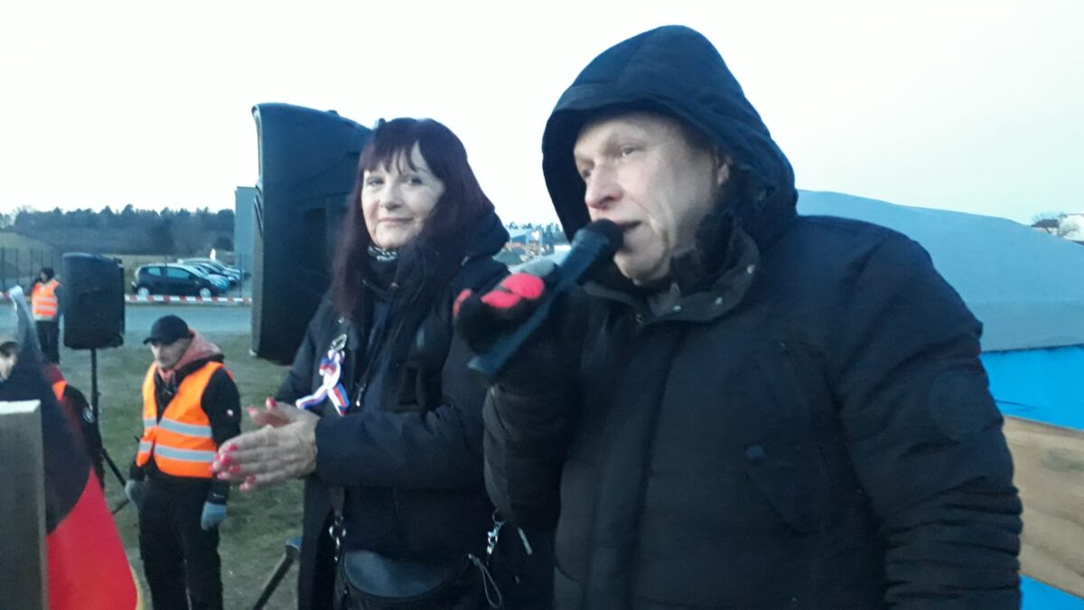 Zwei Tschechen gehen auf die Bühne: Jan Molnar und Radka Dolezalova. Man kennt sich von Veranstaltungen gegen Corona-Maßnahmen. Die Gruppe aus Westböhmen will sich solidarisch mit dem aktuellen Protest im Nachbarland erklären. “Ganz Europa muss Druck machen.” Auch in Tschechien seien „alles sehr teuer“ geworden.