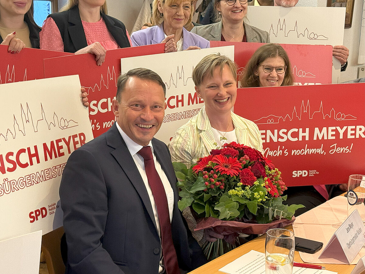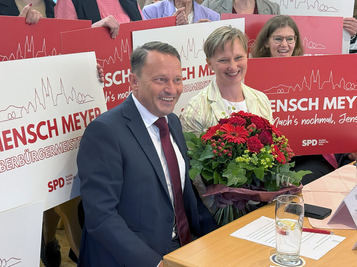 Dieser Mensch Meyer sei wild entschlossen, weiterzulaufen. „Jens und ich sind seit 2002 gemeinsam im Stadtrat – fast so lange wie Thomas Müller beim FC Bayern.“ 23 Jahre, länger als er mit seiner Kathrin verheiratet sei! „Wir haben das Premiumprodukt, das Flaggschiff, den amtierenden Oberbürgermeister.“ Richters Liebeserklärung an den Parteifreund, eine Hommage an kommunalpolitische Handwerkskunst. Mit Seitenhieb auf die Konkurrenz: „Wenn wir Jens vorschlagen, schlagen wir keinen Selbstdarsteller vor – sondern einen, der echt was draufhat.“ Jens rede ja gar nicht so gern.
