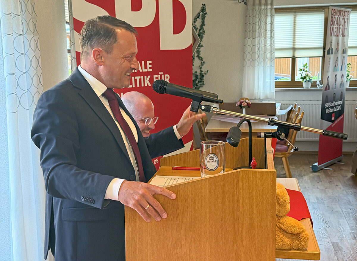 „Ich soll euch vom ,alten Knaben’ Ludwig Stiegler grüßen“, erinnert Meyer gleich zu Beginn an eine ruhmreiche Weidener SPD-Epoche. Er bedankt sich bei seiner Familie und dem Organisationsteam und stellt klar: „Ich bin Kommunalpolitiker durch und durch. In München oder Berlin wäre ich fehl am Platz.“ Seine Verwurzelung in Weiden, sein früher Protest gegen die WAA, seine sozialdemokratische Prägung – das alles kulminiert in einem klaren Bekenntnis: „Ich liebe diese Stadt.“