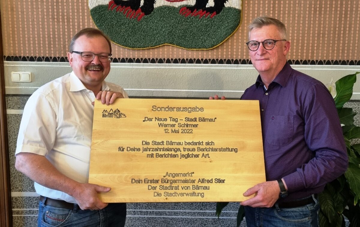 Bürgermeister Stier bedankte sich bei Schirmer auch im Namen des Stadtrates und der Stadtverwaltung in seiner Laudatio für dessen unzähligen Berichte über Bärnau. Anschließend überreichte er ihm unter dem Applaus der anwesenden Stadträte und Verwaltungsvertreter zum Abschied eine Bärnauer Sonderausgabe des Neuen Tags – standesgemäß für Bärnau in Holz.