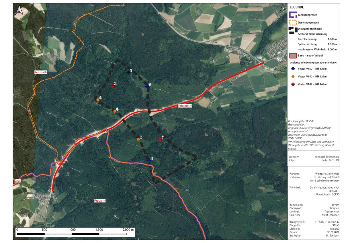 Im „Windpark Silberschlag“ sollen fünf Windräder nördlich und drei südlich der Bundesstraße 299 aufgestellt werden. Im Bereich jener Straße also, die komplett neu gebaut wurde und von Kritikern als „überdimensionierte Autobahn“ kritisiert wird. In der Tat schlug die neue B 299 eine deutliche Schneise in den Wald und trug auch den Abspann des Hessenreuther Bergs um mehrere Meter ab.