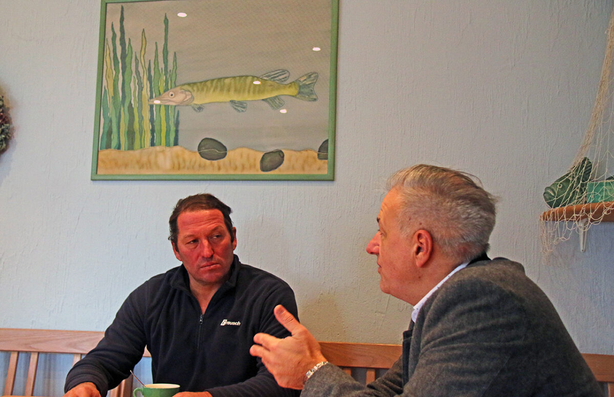 Während wir im familieneigenen Lokal sitzen, schweift der Blick Klaus Bächers immer wieder durchs Fenster: „Da, ein Seeadler“, zeigt er in die Ferne, wo ein winziger Punkt im Herbsthimmel kreist. Man braucht wohl Adleraugen, um das Geschehen rund um die 50 Teiche nicht aus dem Blick zu verlieren. „15 sind gepachtet, der Rest gehört uns.“ Vor drei Jahren seien es noch 54 gewesen. „Wir haben 12 Hektar verloren.“ Der ehemalige Verpächter habe Eigenbedarf angemeldet und im März den Pachtvertrag gekündigt.