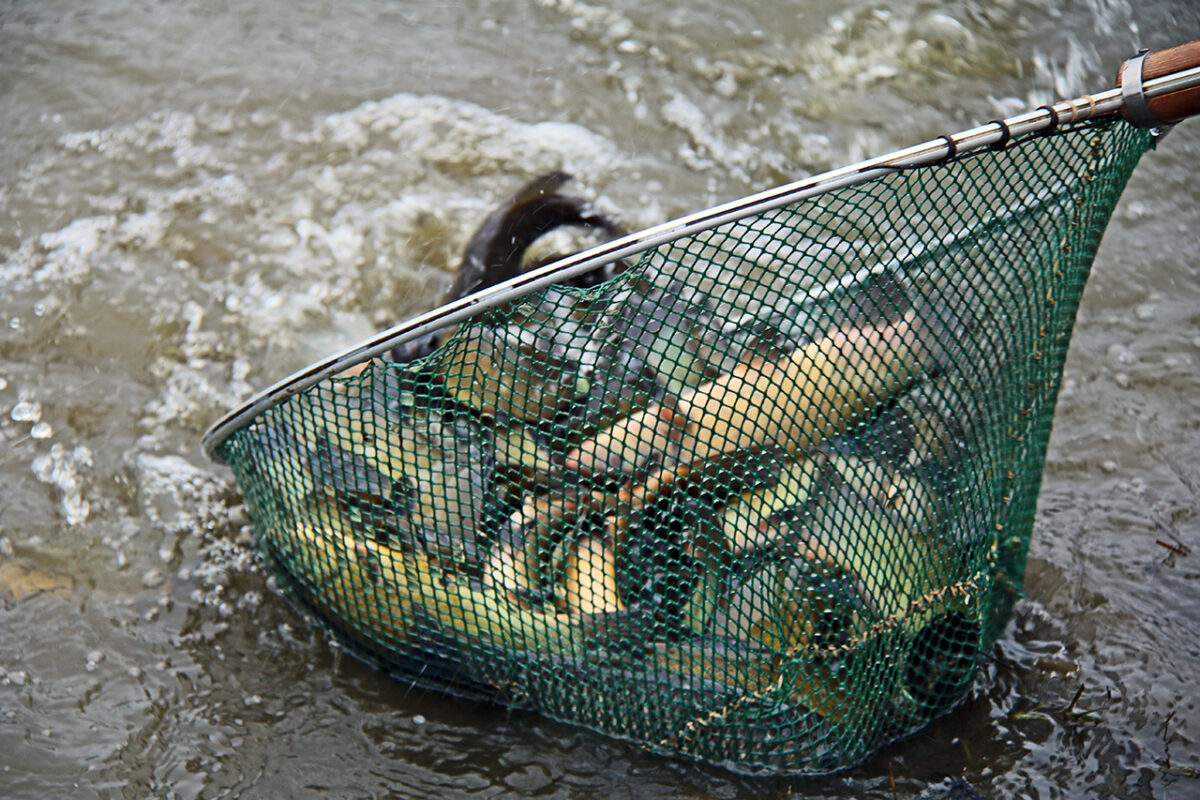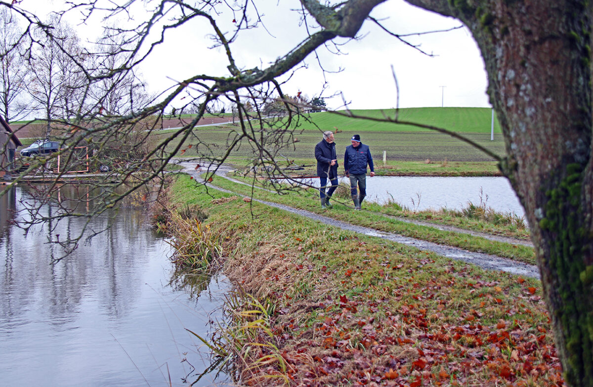 Bächer behält sein Reich der 50 Teiche immer im Auge. „Man sieht ja nicht, dass da unten Teiche sind“, blickt er über die bewaldete Landschaft. „Man schaut immer wieder runter, ob sich was rührt, ein Kormoran, ein Otter.“ Oder ob einer schwarzfischt. „Früher war das Nachfischen üblich.“ Wenn das Gitter erst mal raus ist, sei der Weiher freigegeben. Die Zeiten seien aber vorbei. „Als ich ein 12-jähriger Stamperer war, sind mal die Reuther Burschen durch den Wald gekommen, haben das Gitter rausgenommen und wollten die Fische am Bachauslauf fischen.“ Bächers Vater habe sie aber erwischt. Eine richtige Räuberpistole eben.