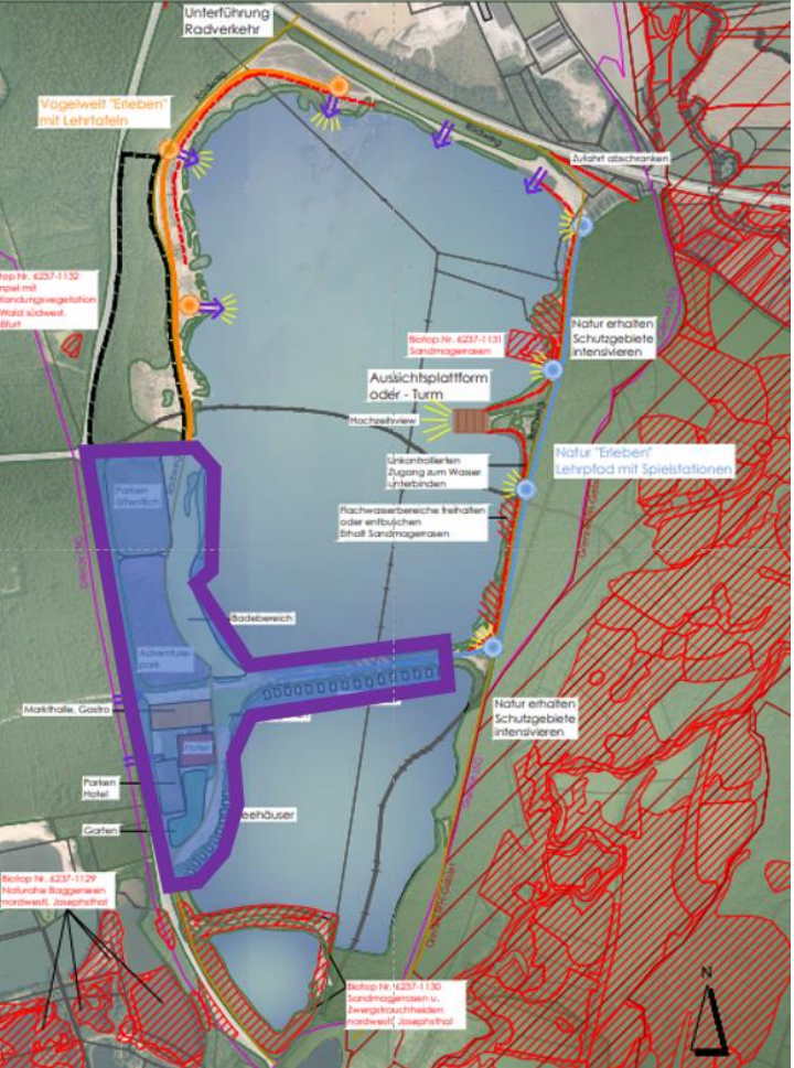 Es gibt zwei finale Konzeptvarianten: eine kurzfristige Interimslösung (nur „Beach“ und Grünes Klassenzimmer) oder der komplette Freizeitpark. Das Beach-Konzept wäre reduziert auf den Badebetrieb für die regionale Bevölkerung und ein grünes Klassenzimmer als Lernort für Umweltbildung.