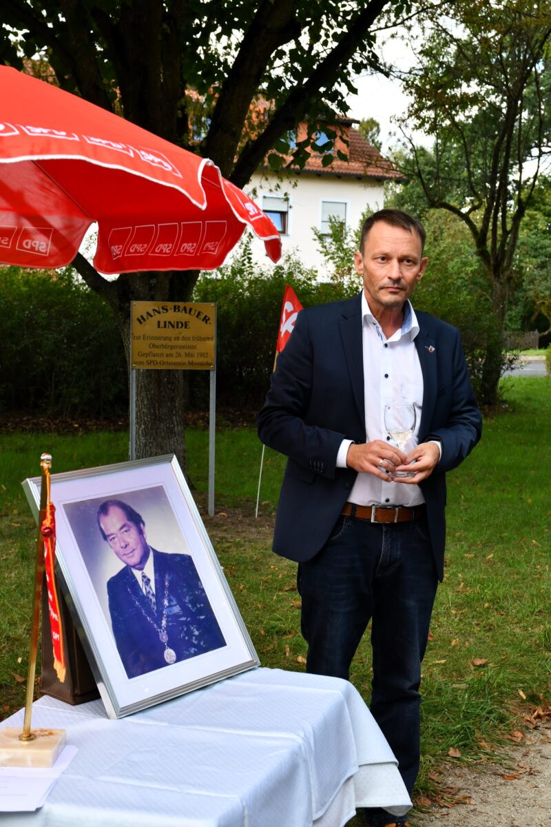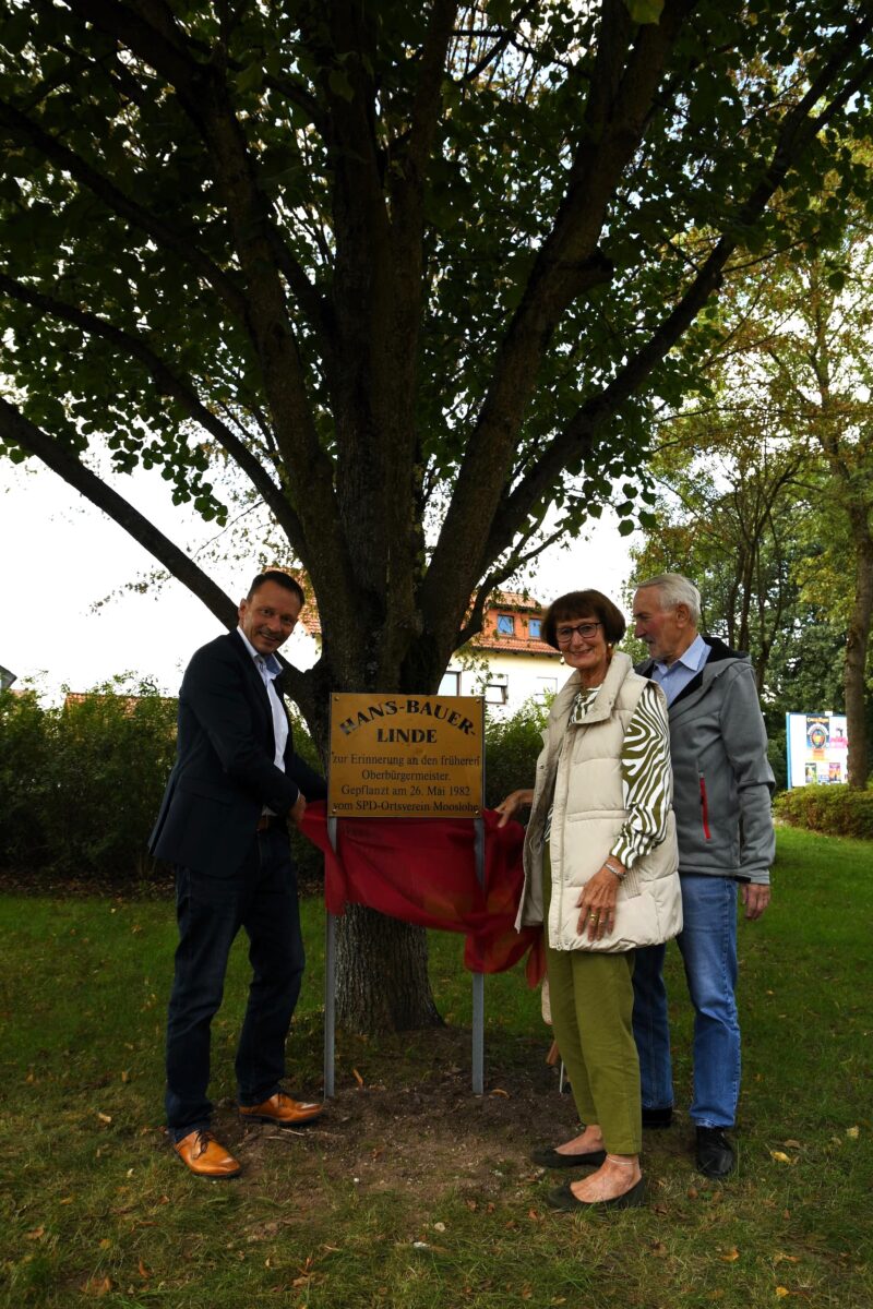 Oberbürgermeister Jens Meyer enthüllte unter dieser imposanten Linde mit der ehemaligen Stadträtin Waltraud Koller-Girke und Horst Marschke, dem ehemaligen Vorsitzenden des OV Mooslohe, die Gedenktafel. Die Stadtverbandsvorsitzende Sabine Zeidler betonte: „Solche Momente zeigen mir, dass wir als SPD für unsere Werte alle gemeinsam einstehen. Hans Bauer ist uns Mut und Inspiration, erfolgreich weiterzumachen“.