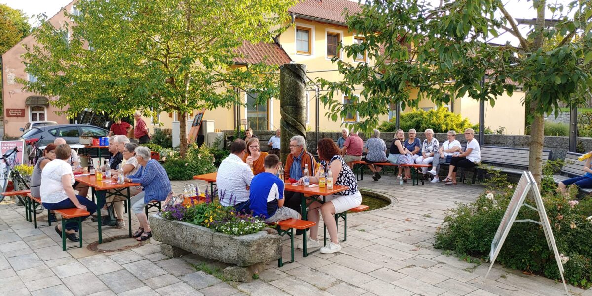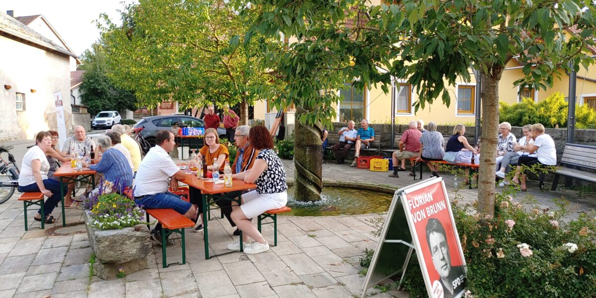 Bei strahlendem Sonnenschein und sommerlichen Temperaturen gesellte sich Bäumler am lauschigen Taubenbrunnen in der Ortsmitte zu den interessierten Bürgern und kam mit ihnen ins Gespräch. Die gebürtige Schirmitzerin ist Lehrerin an der Berufsschule in Schwandorf und zudem seit vielen Jahren politisch aktiv. Neben zahlreichen Ehrenämtern ist sie unter anderem Gemeinderätin in ihrer Heimatgemeinde Schirmitz, Vorsitzende des SPD-Ortsvereins Schirmitz und des SPD-Kreisverbands Neustadt/WN.