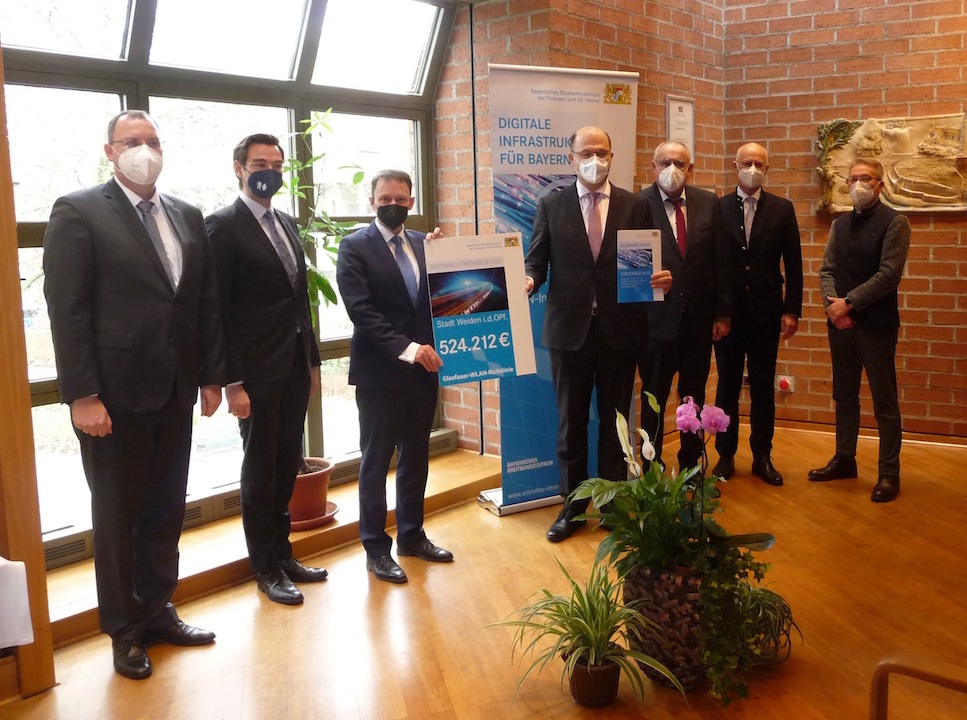 Oberbürgermeister Jens Meyer konnte jetzt nicht nur Bayerns Finanzminister Albert Füracker und dem neuen Regierungspräsidenten Walter Jonas im Rathaus willkommen heißen, sondern auch gleich den Förderbescheid in Höhe von 524.000 Euro für den Glasfaserausbau an Weidener Schulen entgegennehmen. „Der Ausbau und die Weiterentwicklung der digitalen Infrastruktur ist für eine Bildungsstadt wie Weiden von elementarer Bedeutung. Früher wurde in Autobahnen investiert, heute haben die Datenbahnen eine mindestens gleich hohe Bedeutung erlangt“, sagte der Rathauschef.