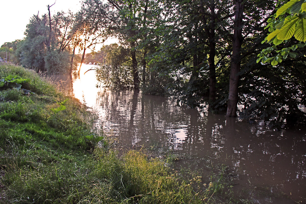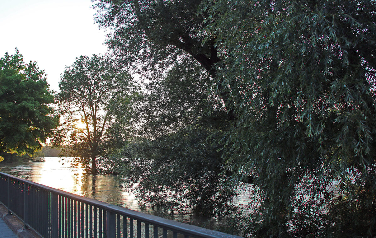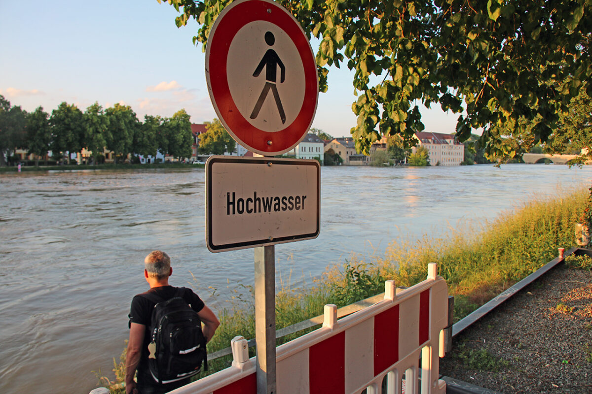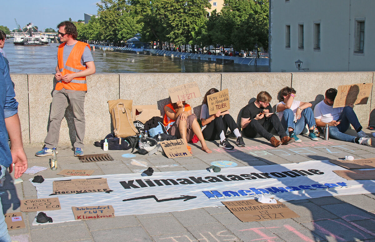 Eine Gruppe Klimaschützer hat ein Transparent mitten auf der Brücke entrollt: „Klimakatastrophe à Hochwasser“. Daneben einige handbeschriftete Kartons, zum Teil auf dem Boden, zum Teil von den jungen Leuten hochgehalten: „Klimakatastrophe ist jetzt!“ – „Jahrhundert voller Fluten!“ – „Keine Gelder in Klimapolitik ist teuer!“ Dazu die immerwährende Diskussion zwischen Überzeugungstätern und Zweiflern: „Hochwasser hat es schon immer gegeben.“