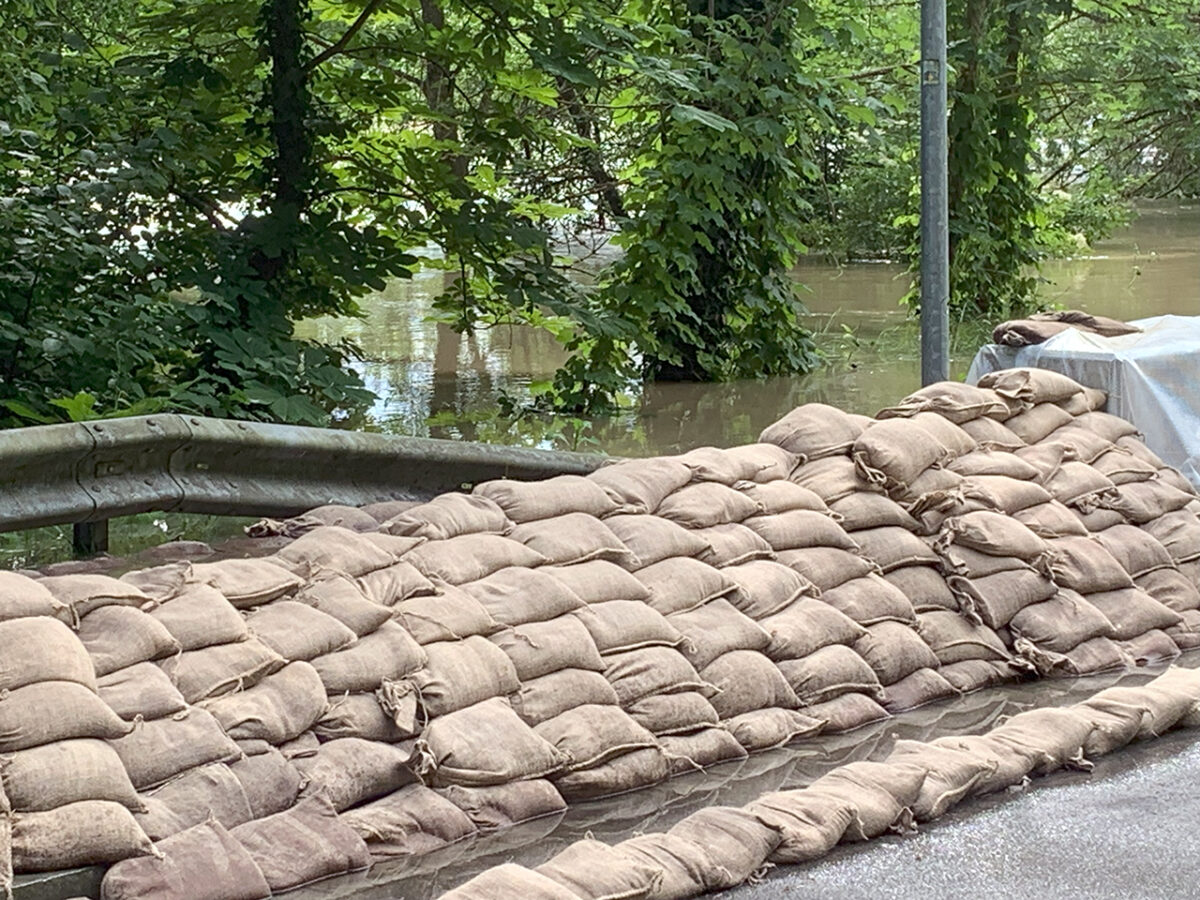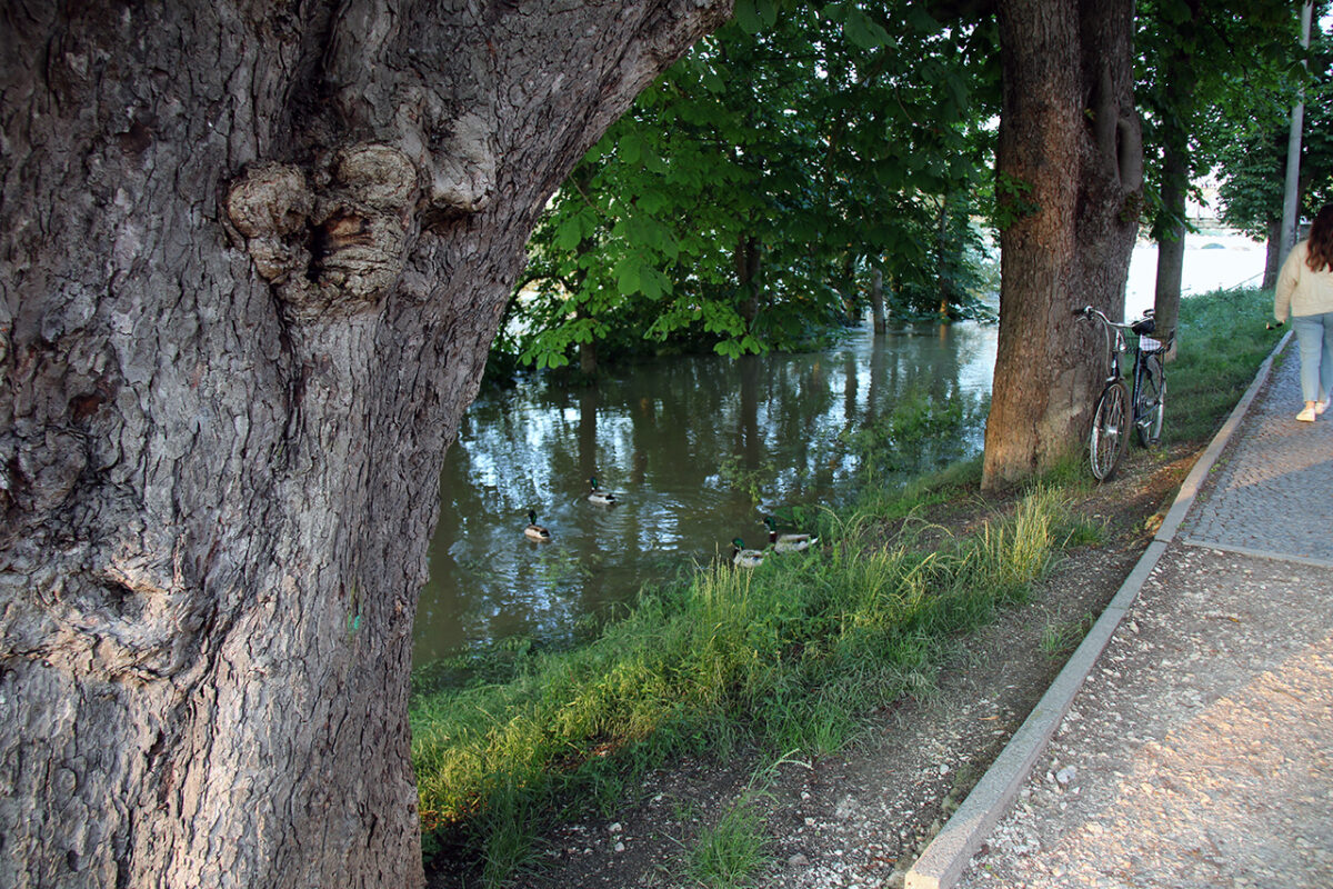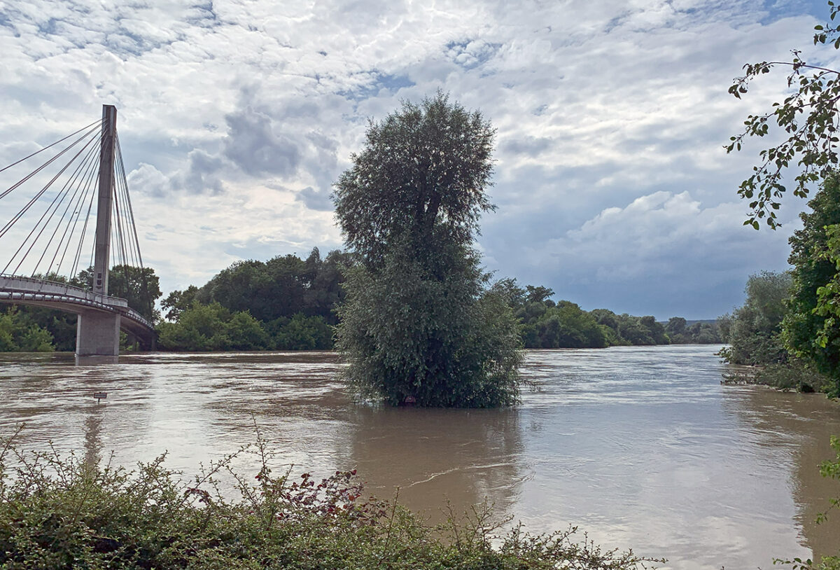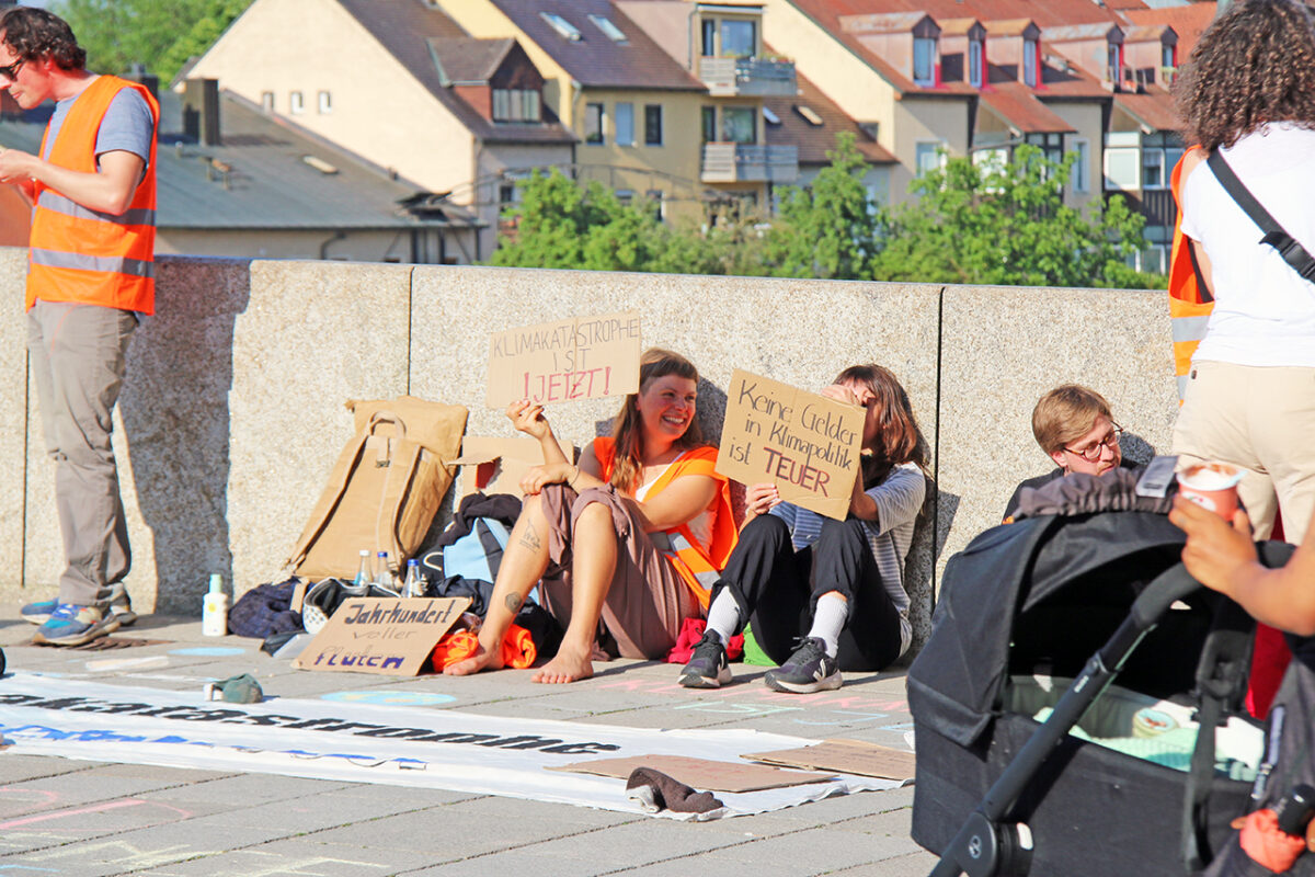 Eine Gruppe Klimaschützer hat ein Transparent mitten auf der Brücke entrollt: „Klimakatastrophe à Hochwasser“. Daneben einige handbeschriftete Kartons, zum Teil auf dem Boden, zum Teil von den jungen Leuten hochgehalten: „Klimakatastrophe ist jetzt!“ – „Jahrhundert voller Fluten!“ – „Keine Gelder in Klimapolitik ist teuer!“ Dazu die immerwährende Diskussion zwischen Überzeugungstätern und Zweiflern: „Hochwasser hat es schon immer gegeben.“