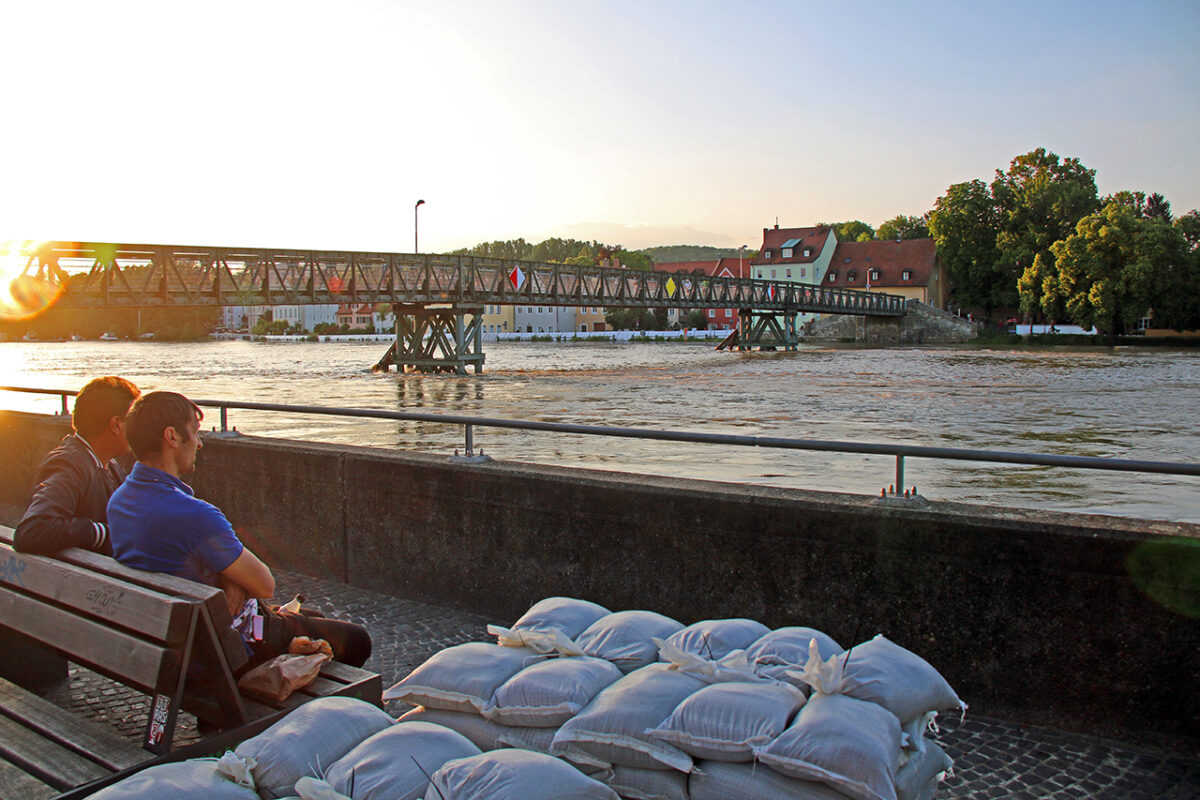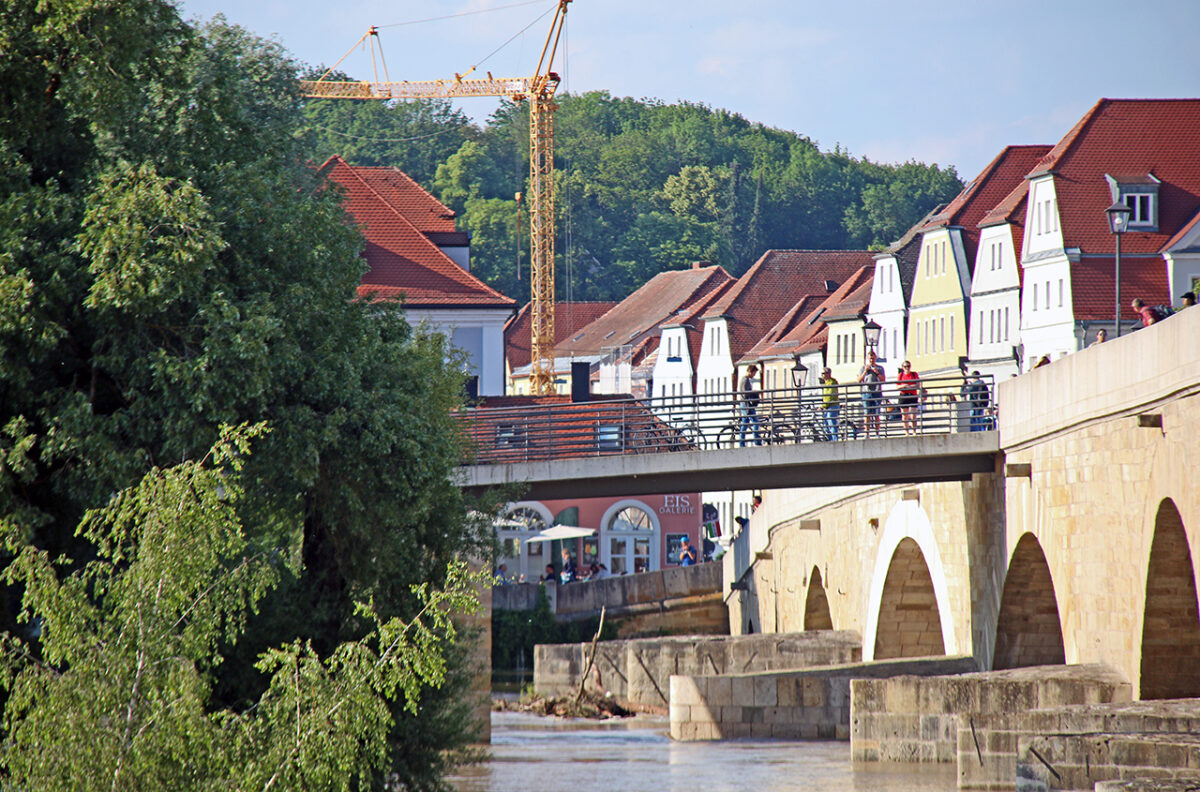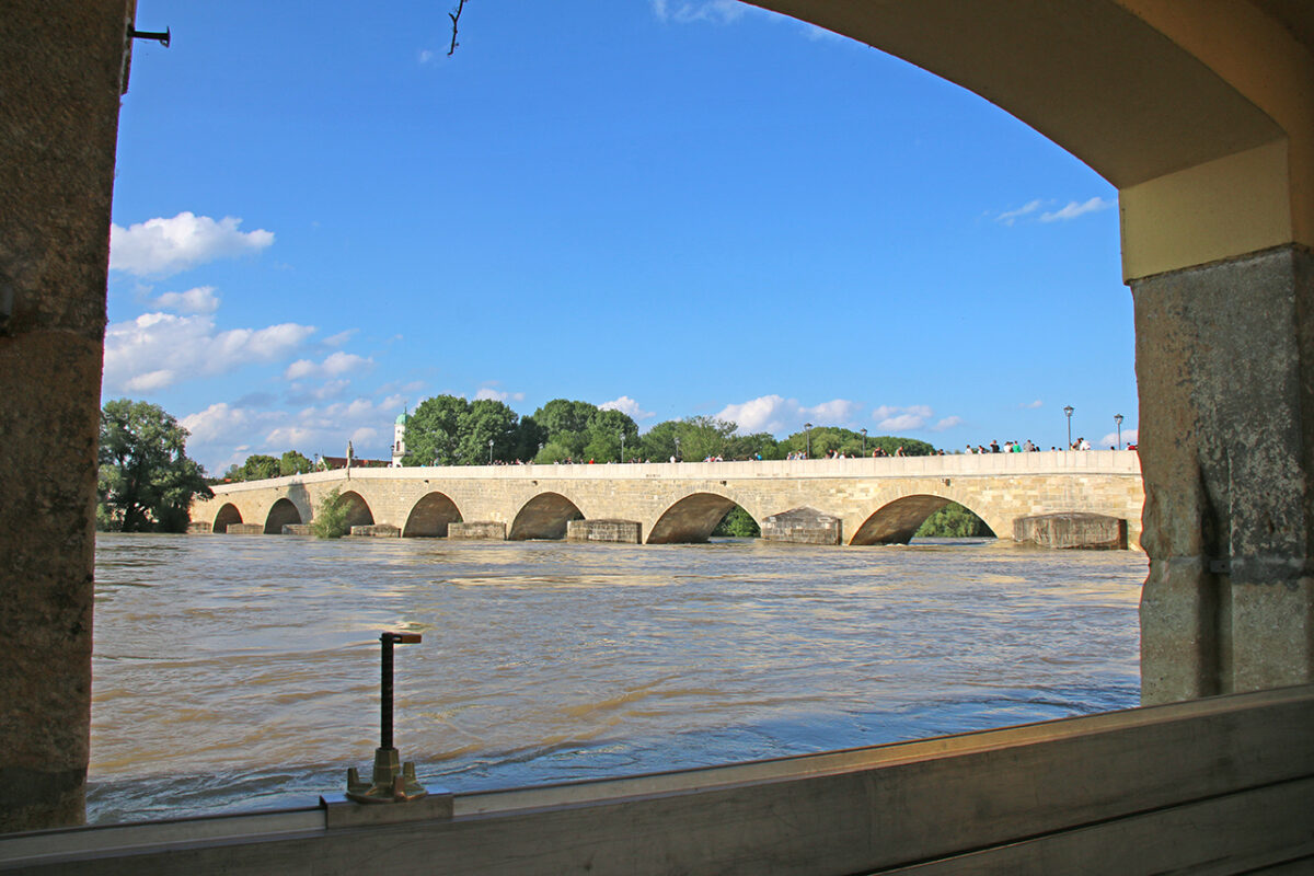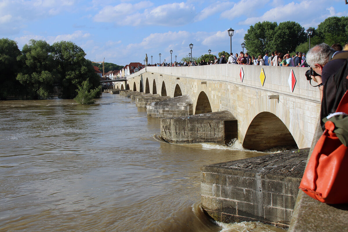 Der Schein trügt. Auf der dicht bevölkerten Steinernen Brücke reihen sich entlang der Brüstung Schaulustige, die „Land unter“ am Donauufer, die überflutete Promenade, Verkehrsschilder auf Tauchstation, Häuser, denen das Wasser bis zum Bauchnabel steht, und die reißende Strömung um die Brückenpfeiler bestaunen.