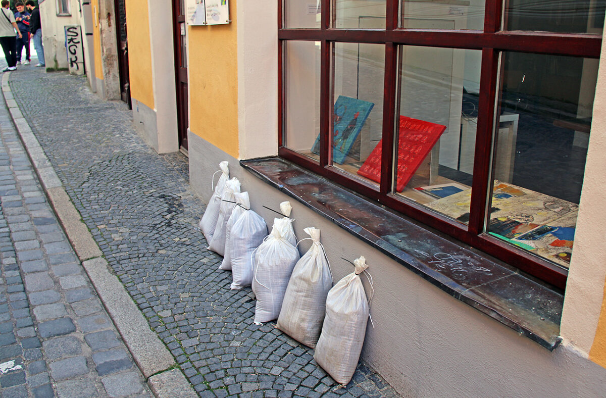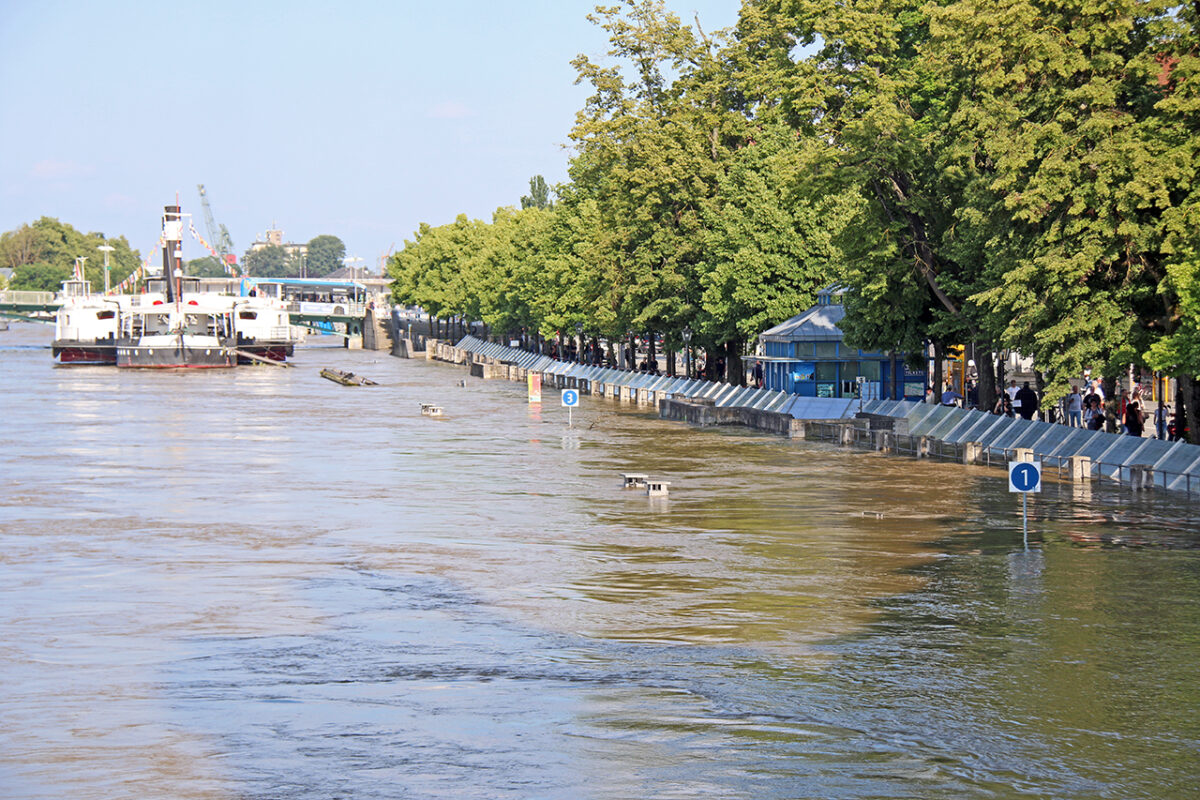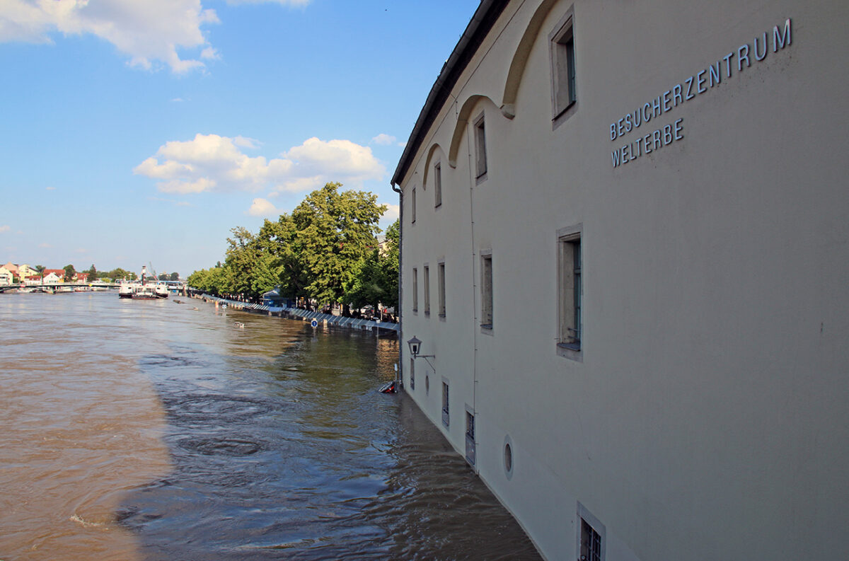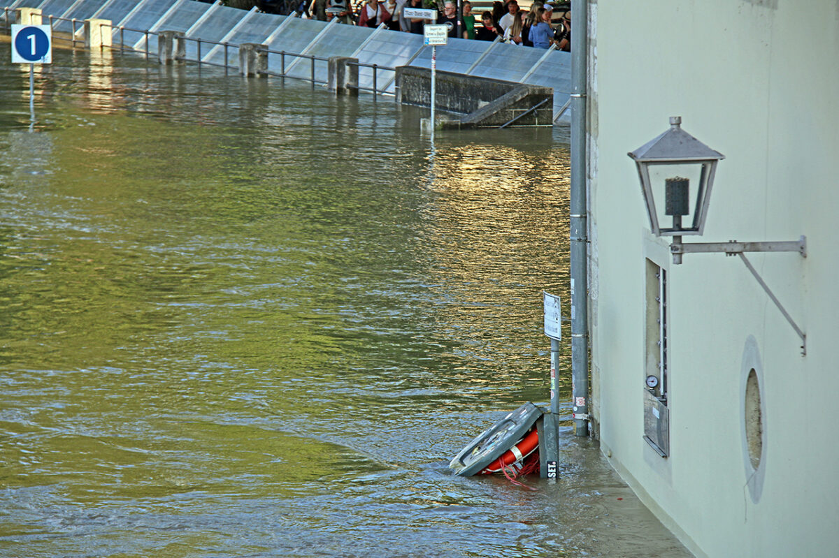 Der Schein trügt. Auf der dicht bevölkerten Steinernen Brücke reihen sich entlang der Brüstung Schaulustige, die „Land unter“ am Donauufer, die überflutete Promenade, Verkehrsschilder auf Tauchstation, Häuser, denen das Wasser bis zum Bauchnabel steht, und die reißende Strömung um die Brückenpfeiler bestaunen.