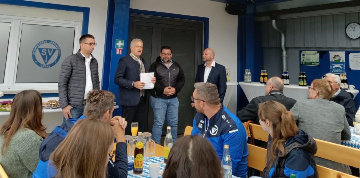 Landrat Roland Grillmeier ging in seinem Grußwort auf die Bedeutung des Projekts ein, dass nicht nur sehr durchdacht und nachhaltig erstellt wurde, sondern ein starkes Zeichen für Zusammenhalt, Eigeninitiative und Dorfgemeinschaft darstellt. Grillmeier unterstrich die Wichtigkeit von Orten, an denen sich Menschen begegnen können. Mit einer kleinen Spende brachte das Landkreisoberhaupt seine Anerkennung zum Ausdruck. Bürgermeister Thomas Kaufmann betonte die Bedeutung des neuen Platzes für Immenreuth, gerade weil man kein zentrales Vereinsheim habe, ist dieser zentrale Ort, an dem mehrere Vereine ihr Klubheim haben, ein echter Gewinn, betonte Kaufmann. Er überreichte dem SV Immenreuth einen Gemeindewimpel als Zeichen der Anerkennung.