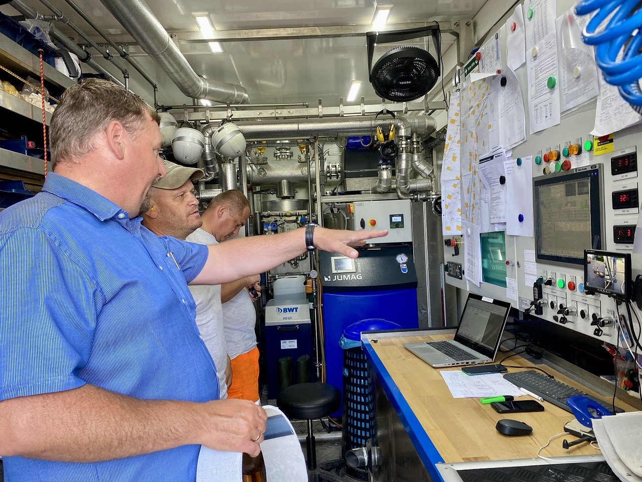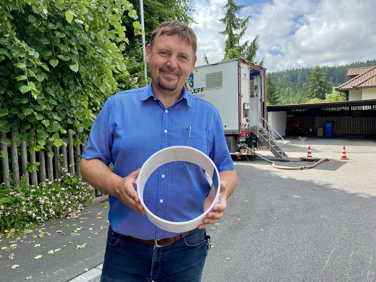 Der Tiefbau-Ingenieur Jürgen Wolfrum vom gleichnamigen Planungsbüro aus dem Raum Nürnberg erläutert Details der Lining-Technik. Die Aarsleff-Lkws werden seinen Worten zufolge noch längere Zeit im Birkenweg und Lindenweg zu sehen sein, denn so sehr die Methode die Straßen schont, so aufwendig ist sie im zeitlichen Ablauf. Die Liner, also die neuen Rohre in den alten brüchigen müssen in den kommenden drei Wochen aushärten, dann sind die Fachleute erneut vor Ort und kümmern sich mittels Robotern um die Hausanschlüsse. Denn die Hausanschlüsse werden von Robotern exakt gefräst, Voraussetzung ist eine vorhergehende millimetergenaue Vermessung.