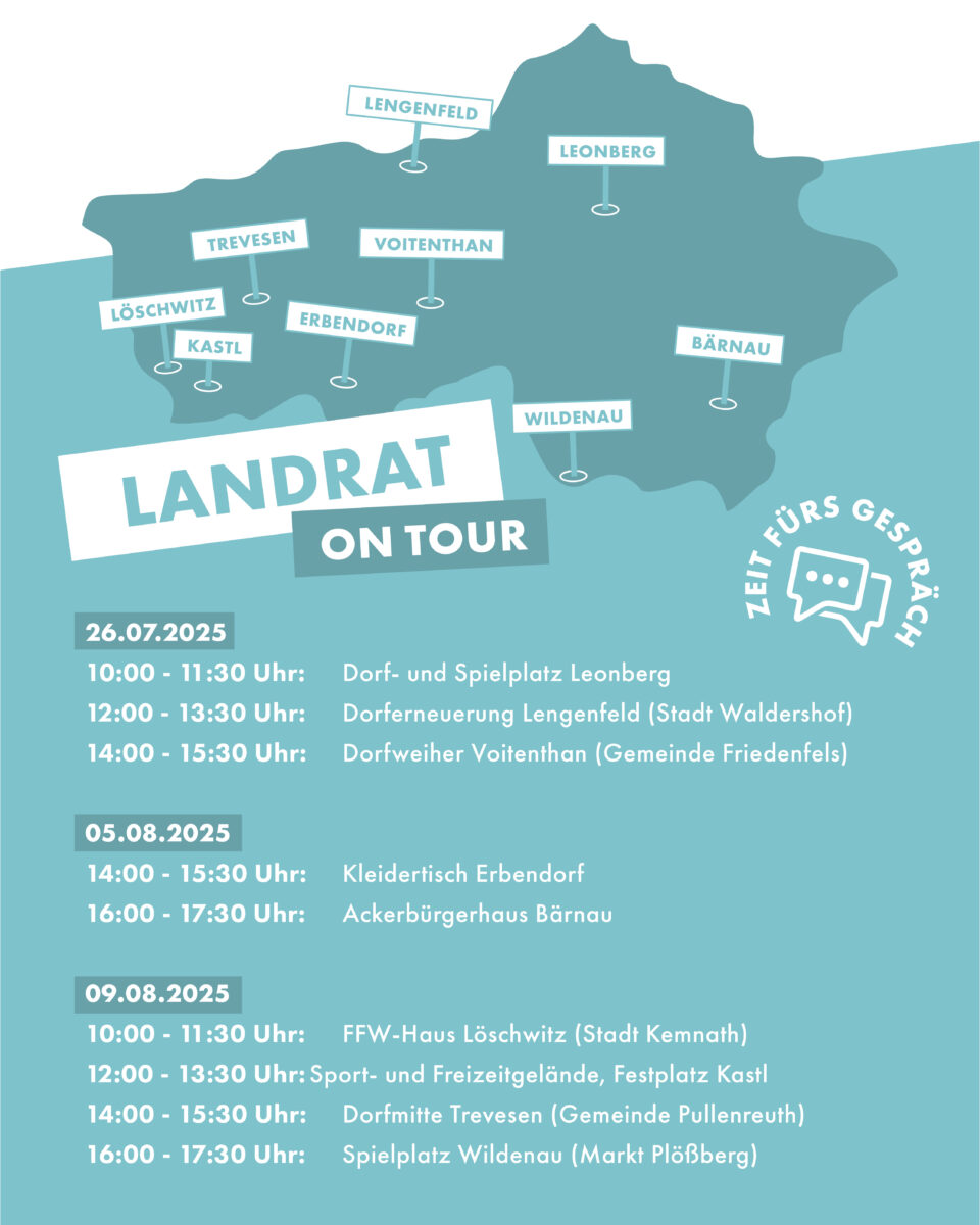 Landrat Roland Grillmeier hat eine besondere Sommertour durch den Landkreis Tirschenreuth geplant. Ziel ist es, direkt und persönlich mit den Bürgerinnen und Bürgern in Kontakt zu treten. „Mir ist wichtig, direkt mit den Menschen zu sprechen – nicht im Büro, sondern dort, wo Projekte entstehen, Ehrenamt gelebt wird und Gemeinschaft funktioniert“, erklärt Grillmeier seine Motivation.