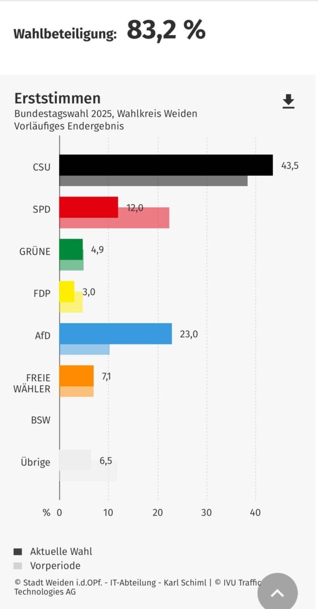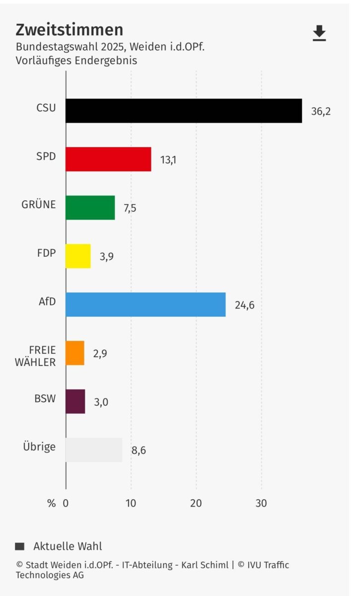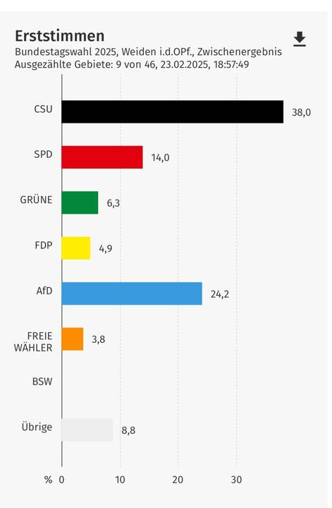 [Update 18.55 Uhr] In Weiden sind aktuell elf Gebiete ausgezählt, bei den Erststimmen liegt die CSU mit 38,7 Prozent vor der AfD mit 24,2 Prozent und der SPD mit 14,0 Prozent (Grüne 6,1, FDP 4,9, Freie Wähler 3,8).