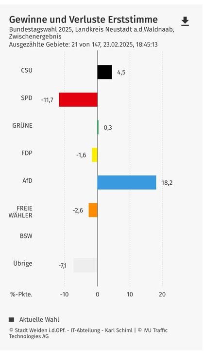 - Die AfD verdoppelt ihren Stimmenanteil im ganzen Wahlkreis. Ein Viertel der Weidener (24,5/24,6 Prozent) wählte AfD. In zwölf Wahllokalen überrundet die AfD die CSU sogar. Höchstes Ergebnis sind 45 Prozent in einem Wahllokal der Europa-Berufsschule (Stadtteil Stockenhut). Im Landkreis Neustadt/WN sind Eslarn (32,4) und Waidhaus (31,4) die Hochburgen der AfD. AfD-Abgeordneter Manfred Schiller kann sich seines Mandates sicher sein. Der Weidener Schiller (Jahrgang 1961) war im Juni 2024 nach der Europawahl in den Bundestag nachgerückt.