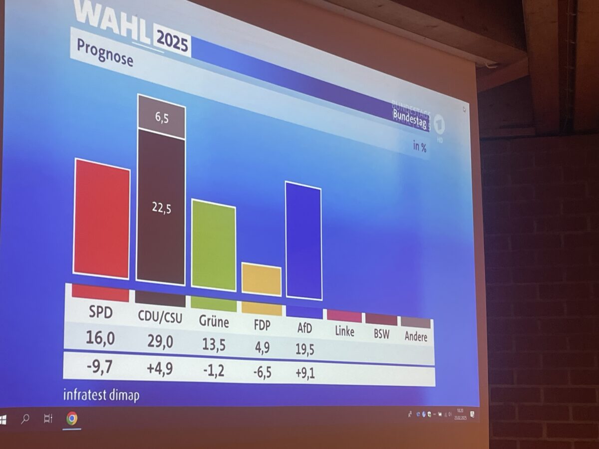 [Update 18.05 Uhr] Das ZDF zeigt erste Hochrechnungen. Ein Raunen geht durch die Reihen angesichts der deutlich geschrumpften SPD. Erste Statements kommen von Benjamin Zeitler, Fraktionsvorsitzender der CSU in Weiden: “Ziel ist, Deutschland wieder in Ordnung zu bringen. Mit dieser geschrumpften SPD wird uns das gelingen.”