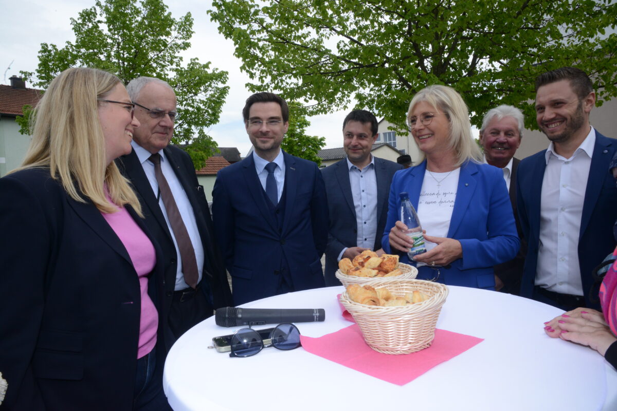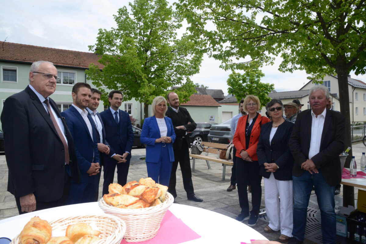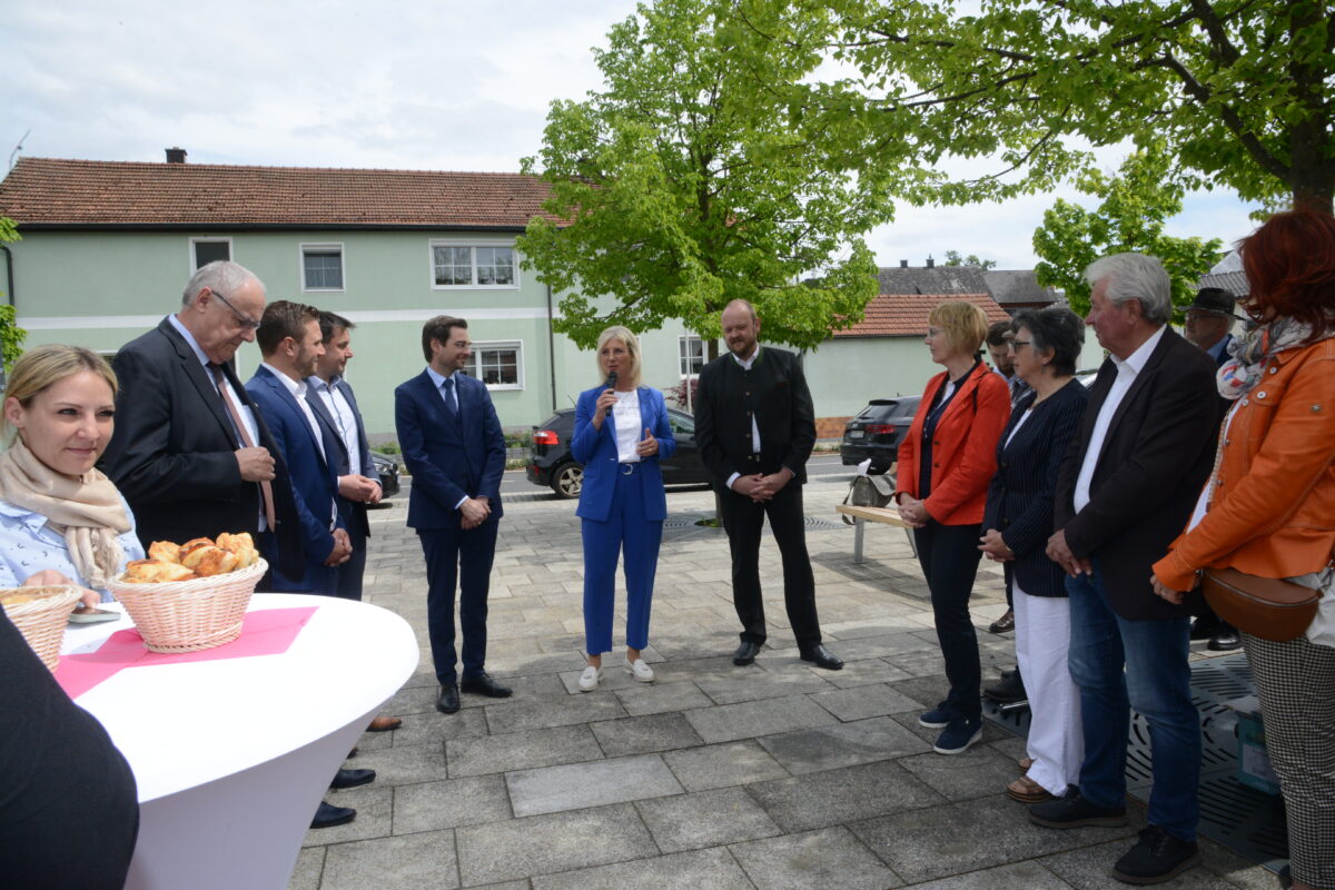 Ulrike Scharf wurde am Dorfplatz neben dem Bürgersaal von den Vertreterinnen des Kreisverbandes der Frauenunion mit der Vorsitzenden Susanne Reithmayer, Ariane Heigl vom Ortsverband der Frauenunion Schirmitz, von Bürgermeister Ernst Lenk, Landrat Andreas Meier, Bezirkstagsvizepräsident Lothar Höher und Landtagskandidat Stefan Gollwitzer willkommen geheißen.