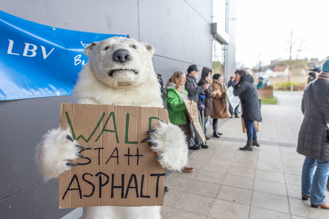 Vor der Teublitzer Stadthalle steppen die Eisbären. Besser gesagt, sie leisten sich einen erbitterten Schaukampf mit dem schwarzen Problembär und seiner Kettensäge. Der steht stellvertretend für die Stadtratsmehrheit in Teublitz – auch wenn SPD und Freie Wähler das Gewerbegebiet trotz Rückschlägen ebenfalls weiter mit auf den Holzweg bringen wollen.
