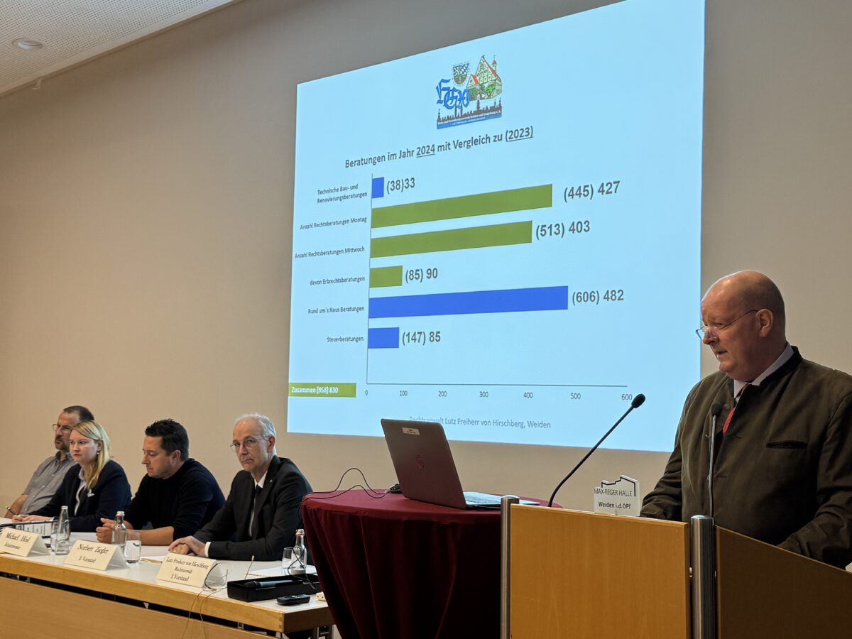 Vorsitzender Lutz Freiherr von Hirschberg konnte auf eine erfreuliche Entwicklung verweisen: Die Mitgliederzahl stieg bis September 2025 auf 4.274. Allein 2024 traten 138 Personen neu ein, während 112 den Verein verließen (Tod, Verkauf der Immobilie usw.). Insgesamt nahmen die Mitglieder im Berichtsjahr 1.430 Beratungen in Anspruch – am häufigsten in den Bereichen Rechts- und Erbrecht. “Über das Leistungsangebot unserer Beratungsstelle gibt die Homepage des Haus- und Grundbesitzervereins Weiden e.V. detailliert Auskunft”, so der Vorsitzende.