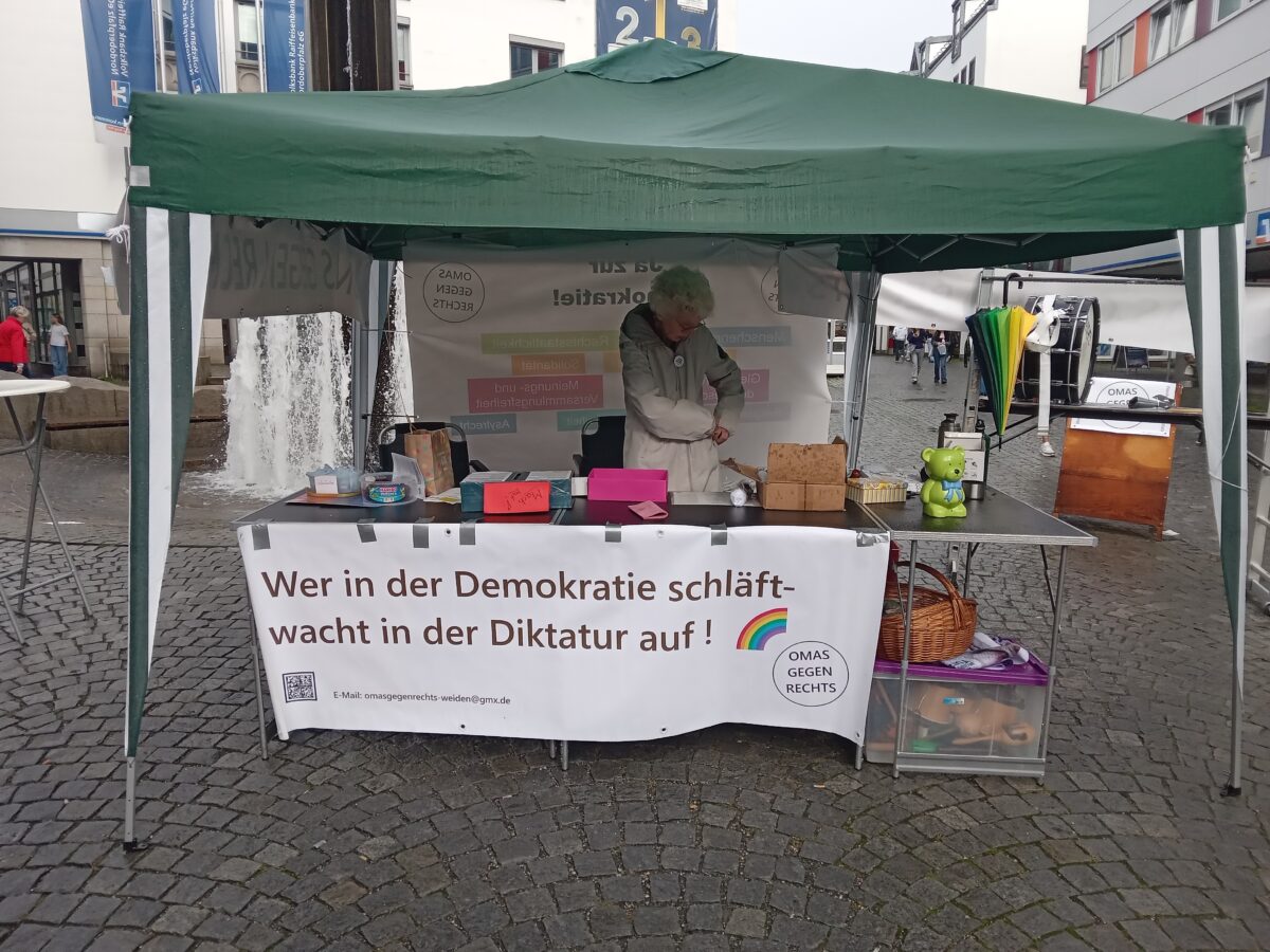 Für den Internationalen Tag der Demokratie am 15. September 2025 hatte die “Omas gegen Rechts”-Gruppe Weiden einen Infostand aufgebaut. Das Anliegen, Menschen vor Rechtspopulismus, Frauenfeindlichkeit, Rassismus und Antisemitismus zu warnen, wurde durch das Verteilen verschiedener Infoflyer erreicht.