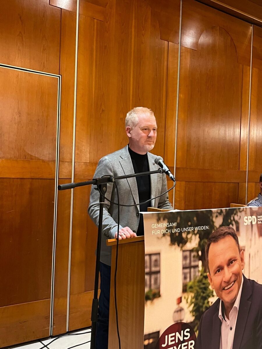 „Mach’s noch einmal, Jens“, hebt Richter gleich zu Beginn seiner lauten und kämpferischen Rede an. Meyer habe sich schon bei der letzten Wahl 2020 gegen seinen Konkurrenten Dr. Benjamin Zeitler durchgesetzt, und dies werde bei der anstehenden Kommunalwahl am 8. März wieder gelingen. Richter verwies auf die große kommunalpolitische Erfahrung Meyers und dessen Fähigkeit, Entscheidungen herbeizuführen. Zeitler warf er vor, ständig nur von Stillstand zu reden, aber selbst wenig bewegt zu haben. „Wer immer von Stillstand in Weiden spricht, hat anscheinend selbst die Arbeit eingestellt“, so Richter. Zudem fordere Zeitler „mehr Geschwindigkeit“, blockiere dann aber in entscheidenden Momenten wichtige Projekte.