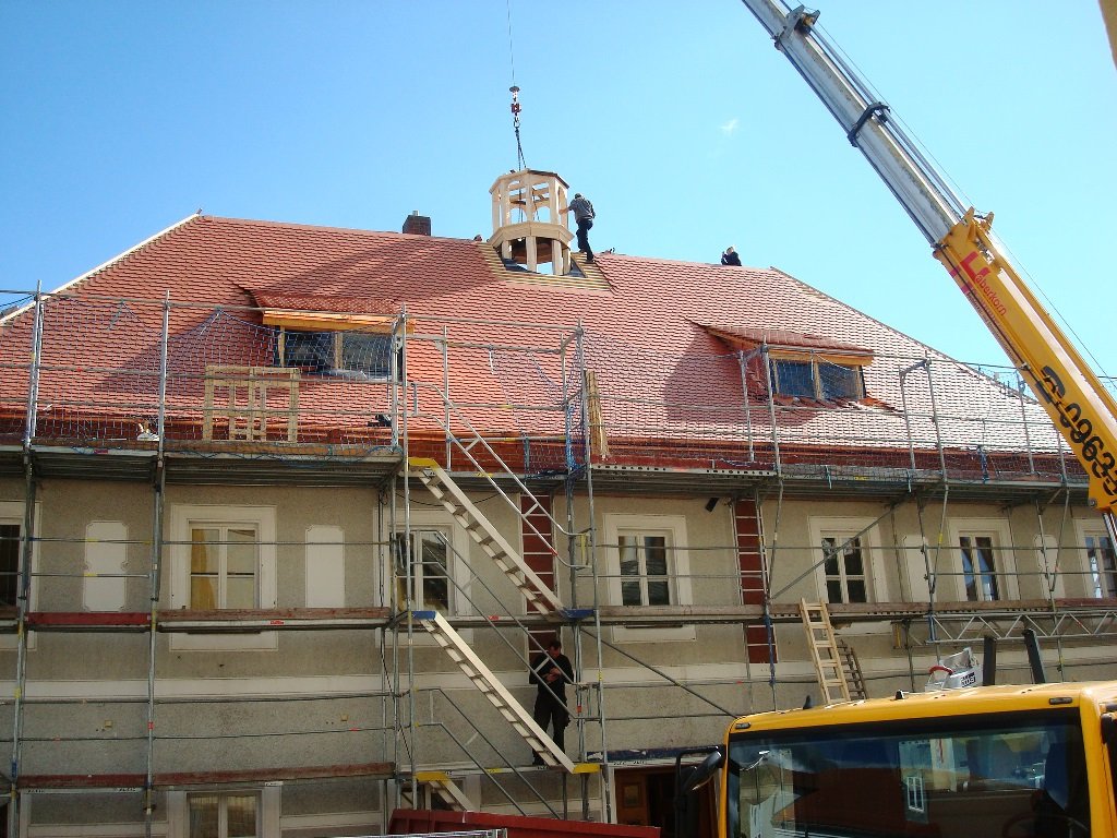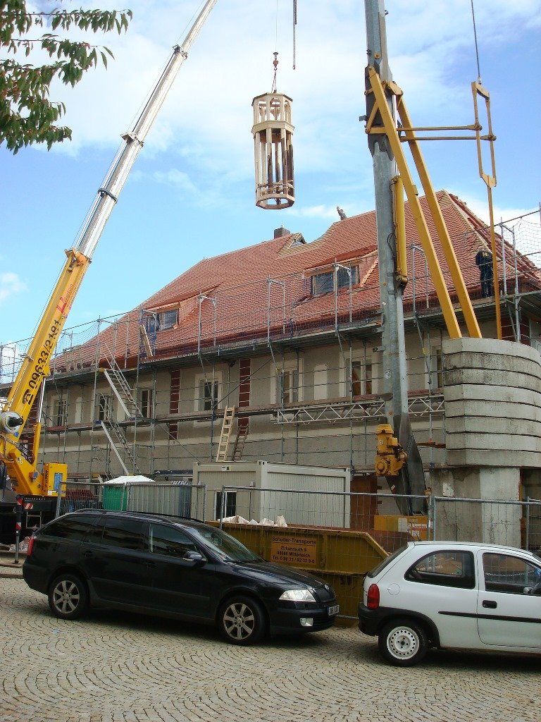 Jetzt hat ein Zimmereibetrieb das Holz des Turmes erneuert, aber dabei weitgehend noch alte, gut erhaltene Holzteile, mit verwendet. Das war eine Auflage des Landesamtes für Denkmalschutz. Die neue Holzkonstruktion wurde nun vergangene Woche mit einem Kran aufgesetzt. Der Turm sitzt auf der obersten Balkenlage des Dachbodens des Rathauses auf. Milimetergenaue Arbeit war notwendig, um die Teile passgenau wieder ins Rathausdach einzufügen.