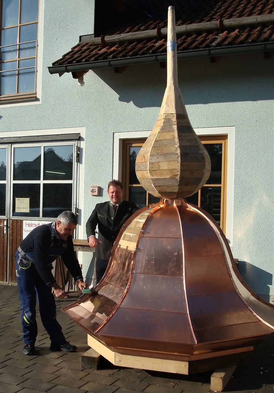 Es ist schon einige Tage her, dass das Türmchen wieder auf dem Rathaus-Dach sitzt. Aber es ist noch nicht vollständig. Es fehlen noch der eigentliche Turm und vor allem Kugel und Fahne. Dieses letzte Detail ist zurzeit noch in Arbeit. Dafür ist echte Handwerkskunst notwendig. Und nicht jeder Handwerker beherrscht die Technik, einen Turm mit Kupfer einzukleiden. Spenglermeister Helmut Kipferl aus Münchsgrün hat sich an die nicht leichte Aufgabe herangewagt.