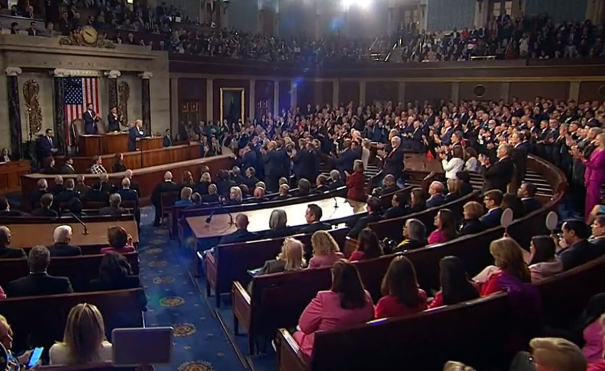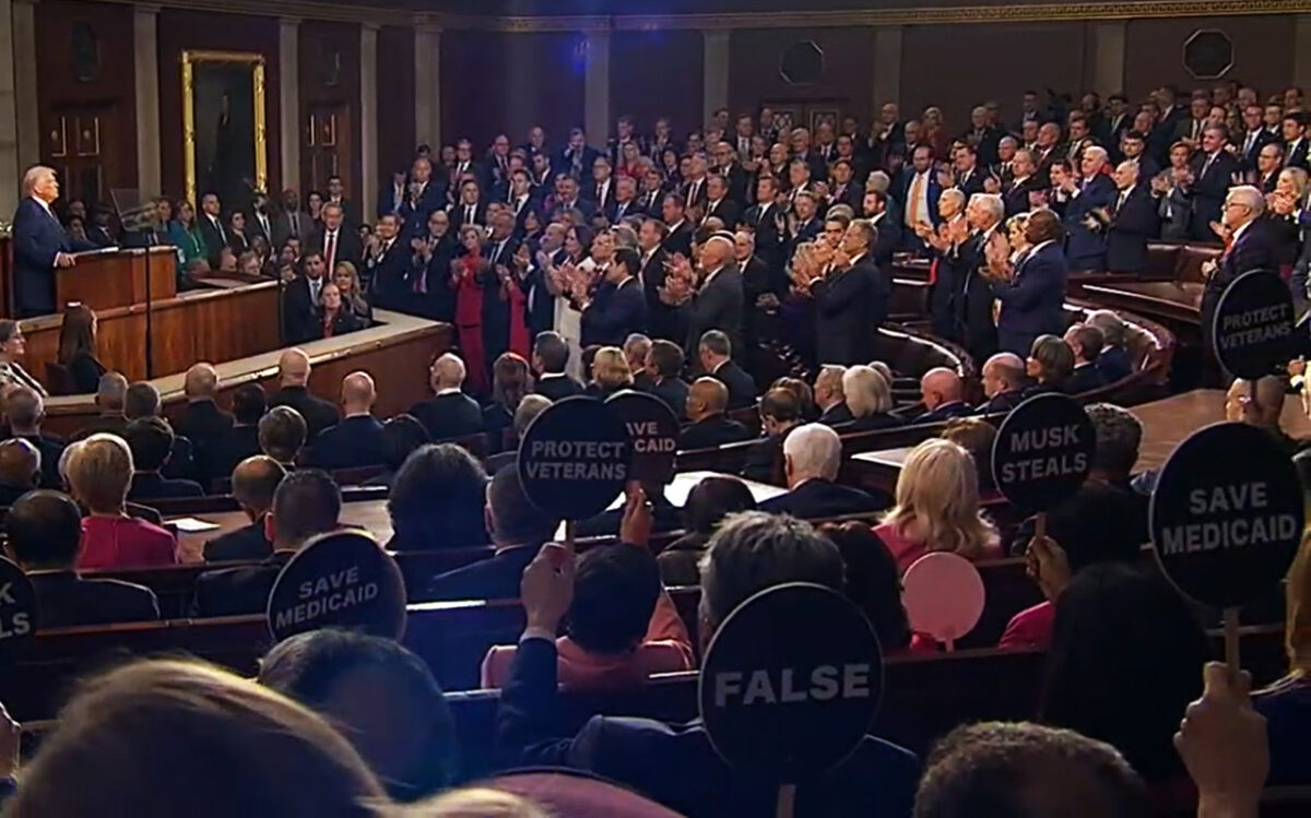 In den vergangenen Jahren sei das Justizsystem von radikalen Linken auf den Kopf gestellt worden. „Meine Regierung hat schnell und entschlossen gehandelt.“ Angefangen beim FBI: „Kash Patel, great Job, vielen Dank“! Und dem Justizministerium: „Danke Pam Bondi!“ Und er habe die Todesstrafe verpflichtend für Polizistenmörder eingeführt. Jeden Tag arbeite er an der Wende, die dieses Land brauche: „Einstellungssperre, Stopp der Auslandshilfe, des lächerlichen Green-Deals, der uns Billionen kostet, die andere Länder nicht zahlen.“ Standing ovations, Jubel, Gekreische, „USA, USA, USA …“ – verzweifelte, fassungslose Demokraten.