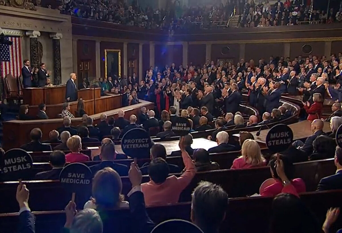 Einige Demokraten halten Schilder mit Slogans wie „MUSK STEALS“ (dt.: „Musk klaut“) hoch. Der Tesla-Chef wurde von Trump mit dem umstrittenen Kürzungsprogramm auf Bundesebene beauftragt. Trump ficht es nicht an: „Wir haben Inkompetenz, Betrug beseitigt.“ Ein Highlight seiner Rede hat er offenbar der Genesis entliehen, die Methusalem das biblische Alter von 969 Jahren nachsagte.