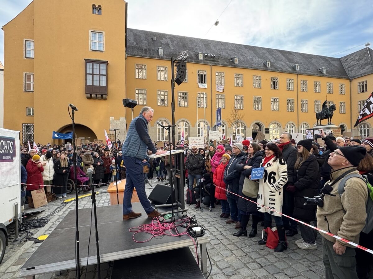 Auch von CampusAsyl e.V., dem Deutschen Gewerkschaftsbund, sowie feministischen und antifaschistischen Gruppen kamen eindringliche Warnungen vor den Folgen rechter Politik für vulnerable Gruppen, die zusammen weite Teile der Gesellschaft ausmachen. “Der Appell ist klar: Die extreme Rechte und ihre Steigbügelhalter kommen an uns nicht vorbei”, so Sprecher Oswald. Parteipolitische Reden waren nicht erwünscht, es sollte nicht um Wahlwerbung gehen, sondern um den Zusammenhalt von Demokratinnen und Demokraten über Parteigrenzen hinweg.
