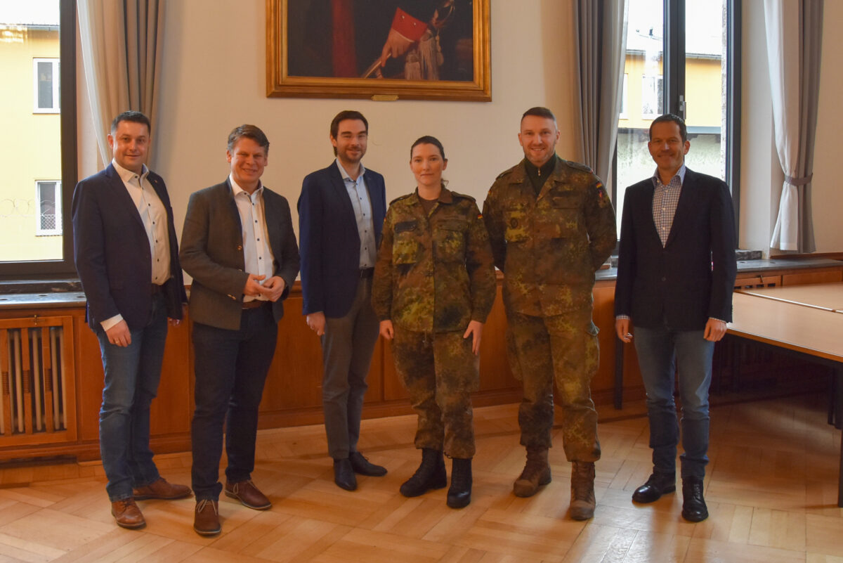 Oberstleutnant Hekja Werner und Oberstleutnant Stefan Zadlo empfingen die Abgeordneten sowie Herrn Benjamin Zeitler und Herrn Stephan Gollwitzer in der Kaserne. In einem Informationsgespräch bekam Rupprecht einen Überblick zum aktuellen Sachstand über laufende und geplante Projekte. Insbesondere die Umstrukturierung der Artillerie, die laufende Aufstellung und Zielstationierung des Panzerartilleriebataillons 375 und die infrastrukturellen sowie sozialen Herausforderungen von beiden Verbänden in dieser gemeinsamen Übergangsphase am Standort Weiden wurden beleuchtet.