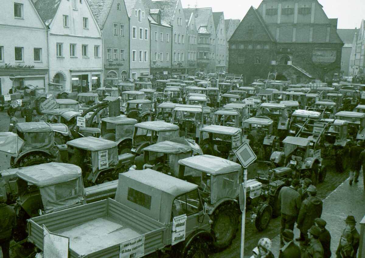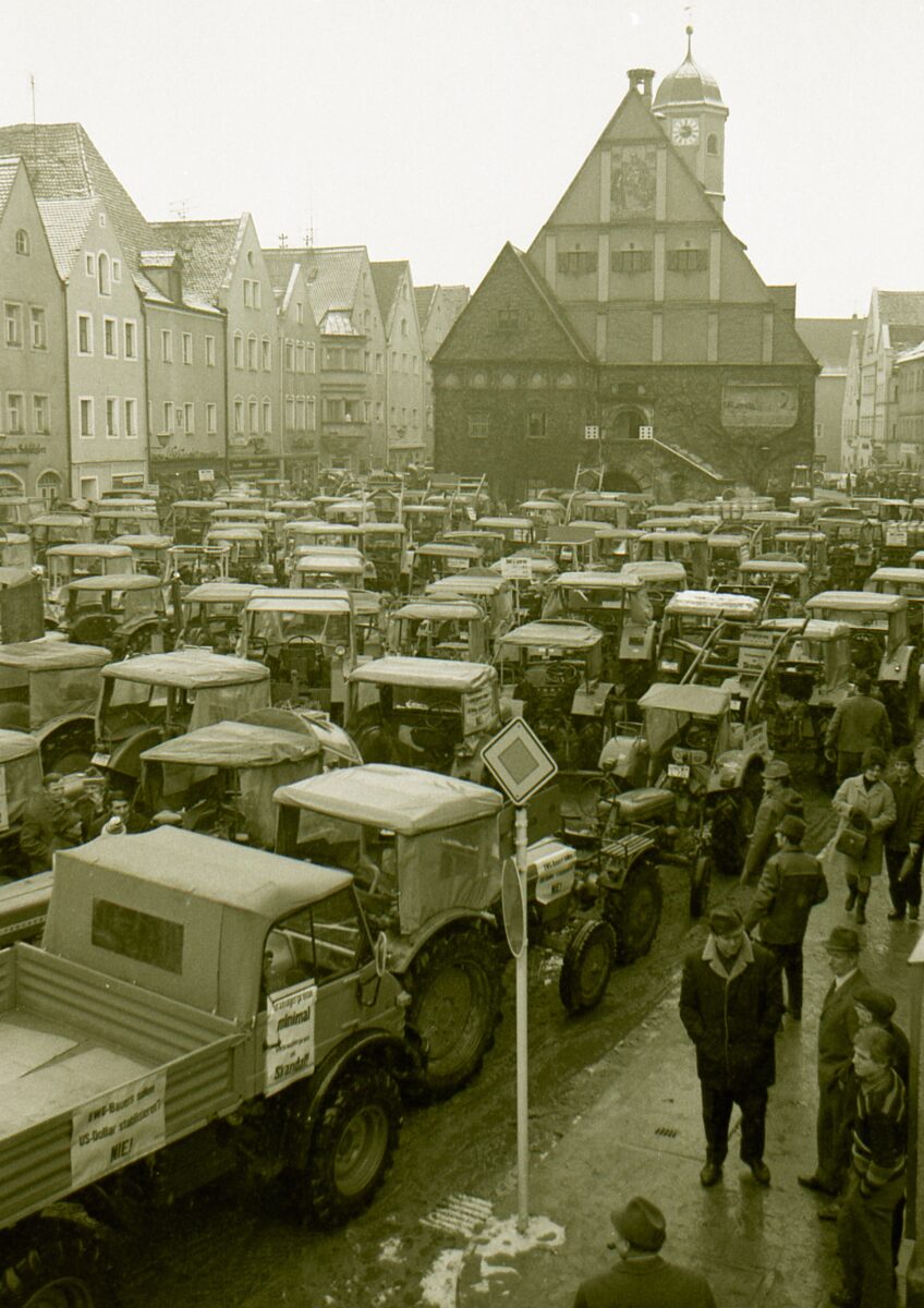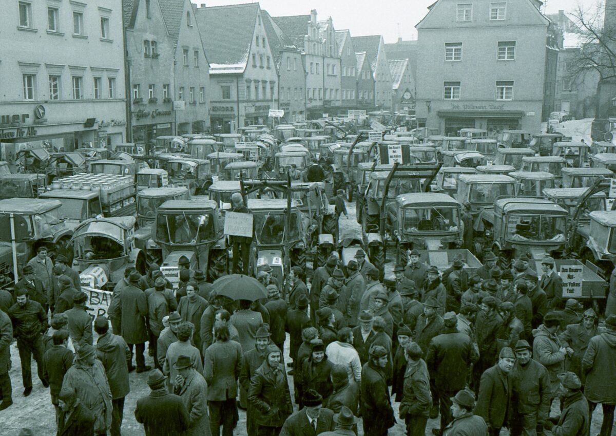 Dr. Sebastian Schott hat im Stadtarchiv gestöbert. “Unsere Bauern stiegen auf die Barrikaden” lautete die Schlagzeile vom 12. Februar 1972. Vor exakt 52 Jahren gab es demnach schon einmal eine groß angelegte Protestaktion der Landwirte. Dabei gelang Fotograf Rudi Bonkoß, dessen Archiv der Stadt gehört, die beeindruckende Aufnahme von jeder Menge Traktoren auf dem Oberen Markt – damals noch keine Fußgängerzone. Der Konvoi reichte ums Alte Rathaus herum und zurück bis zum Justizgebäude.