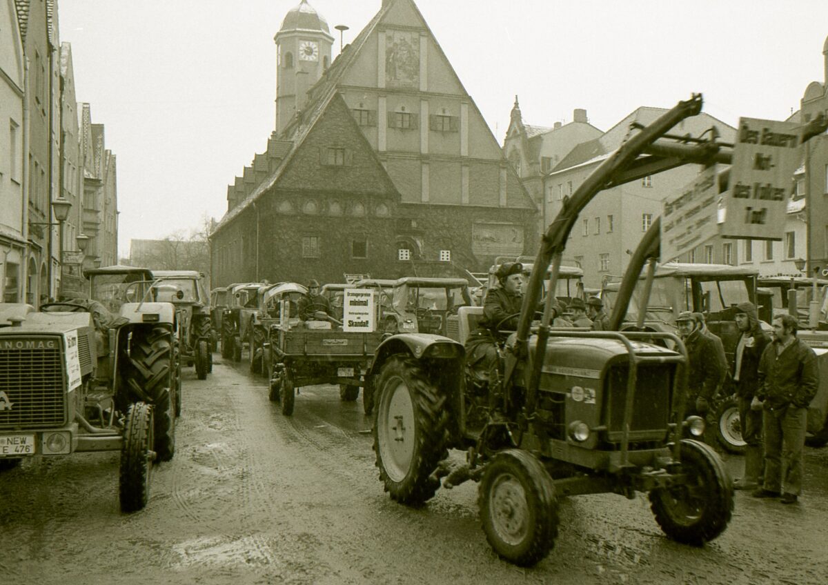 Die Polizei sprach damals von rund 700 Bauern, die mit ihren Traktoren nach Weiden gefahren waren. “Unter Aufbietung aller Kräfte” sei es gelungen, “einen totalen Zusammenbruch des Verkehrs in der Innenstadt zu verhindern”. Aus allen Richtungen fuhren Landwirte direkt in die Innenstadt. Weil der Platz vor dem Alten Rathaus überfüllt war, leitete die Polizei die Traktoren auf den Naabwiesenparkplatz um.