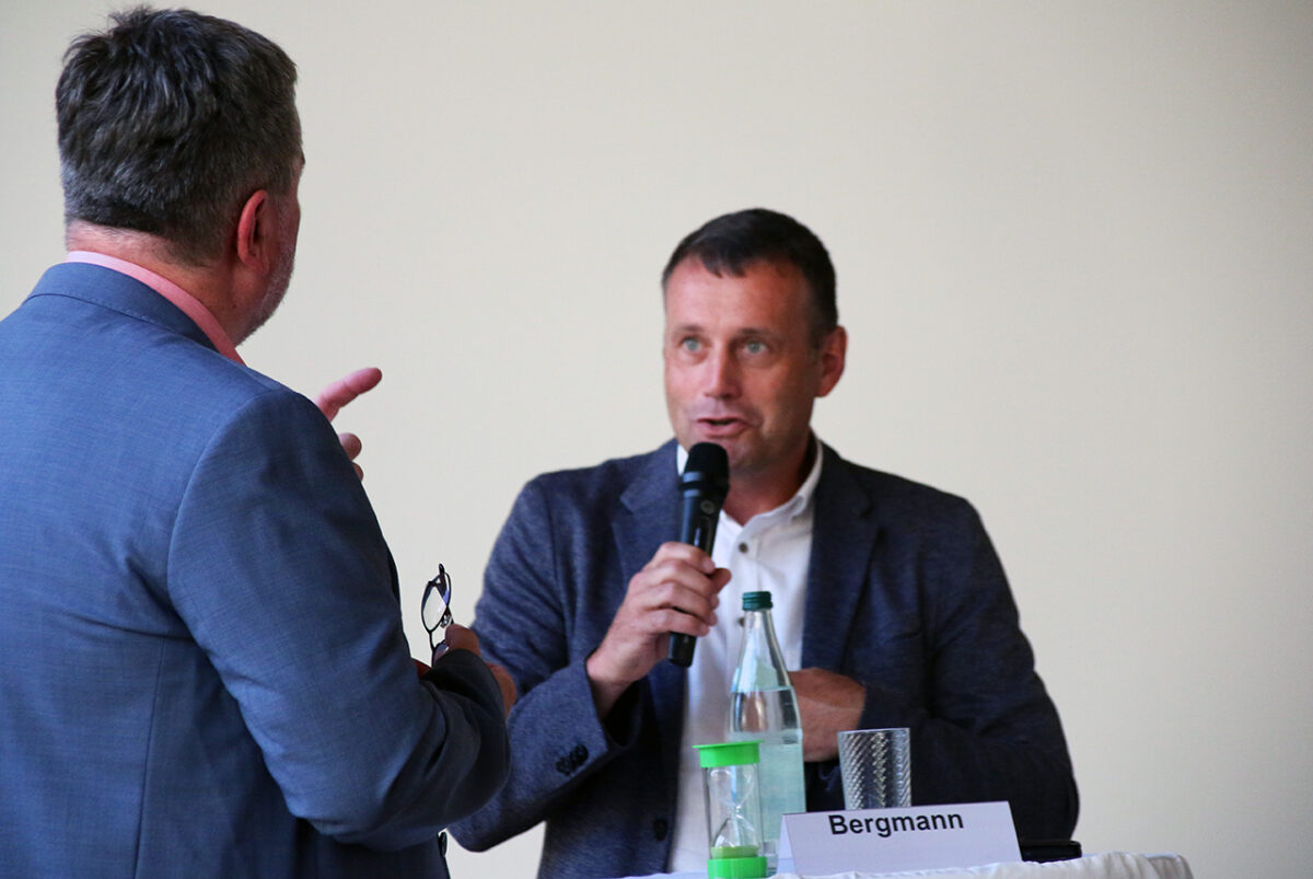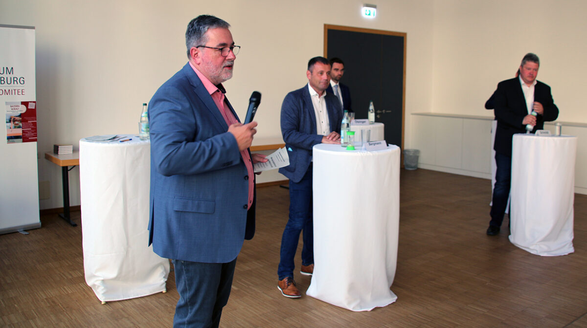 Antreiber der rasanten Runde ist Richard Wittmann, Leiter der Fachstelle Betriebsseelsorge beim Bistum Regensburg, der als Stichwortgeber das Herrenquartett ohne Dame moderiert – die Grüne Kandidatin Anna Schwamberger ist verhindert. „Gegrillt wird hier niemand“, versichert der Experte für Katholische Soziallehre den Teilnehmern einen zivilen Charakter der Veranstaltung.