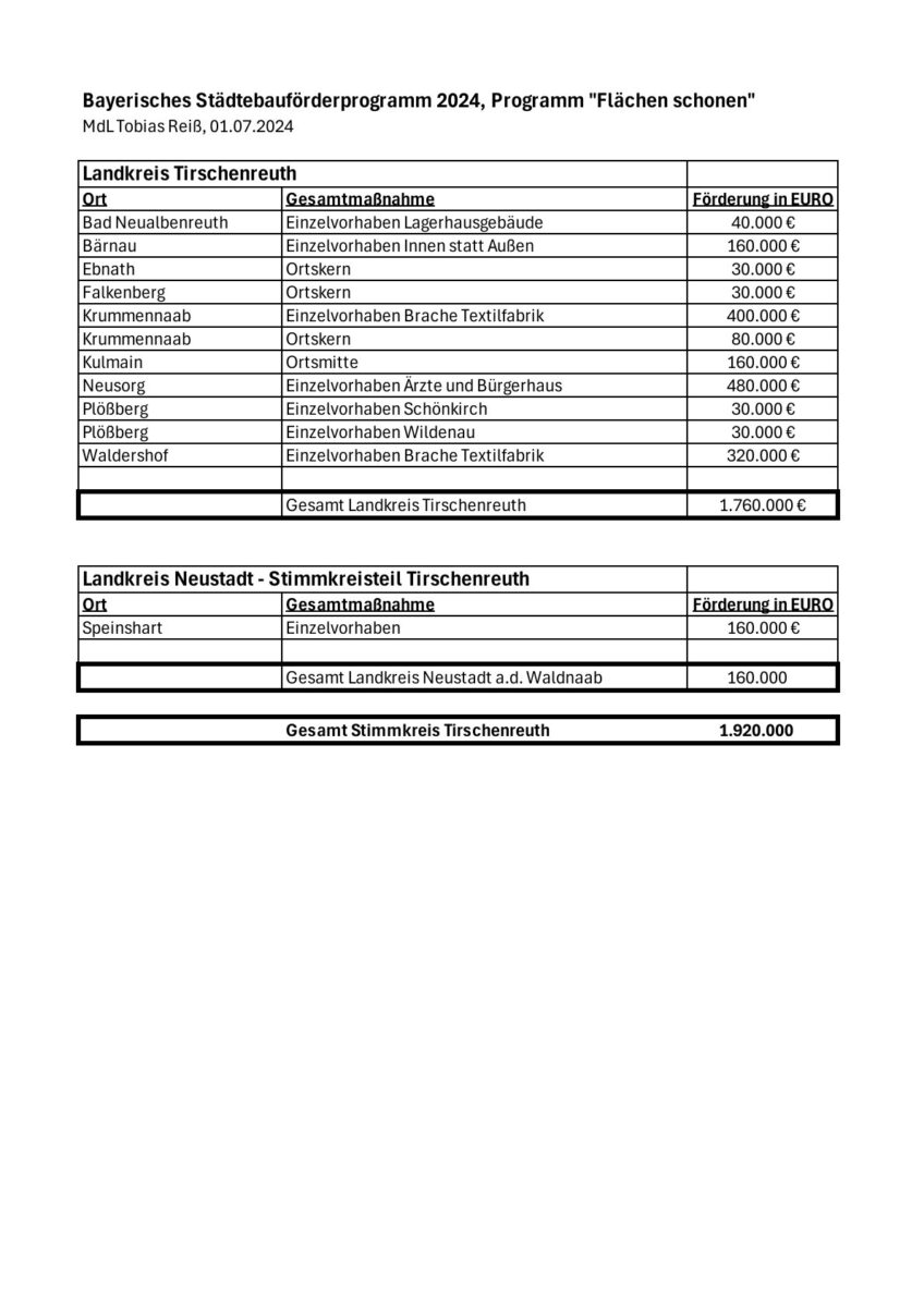 In den Landkreis Tirschenreuth fließen 1.760.000 Euro. Zusätzlich erhält die Gemeinde Speinshart im Landkreis Neustadt/WN (Stimmkreis Tirschenreuth) 160.000 Euro für ein Einzelvorhaben.