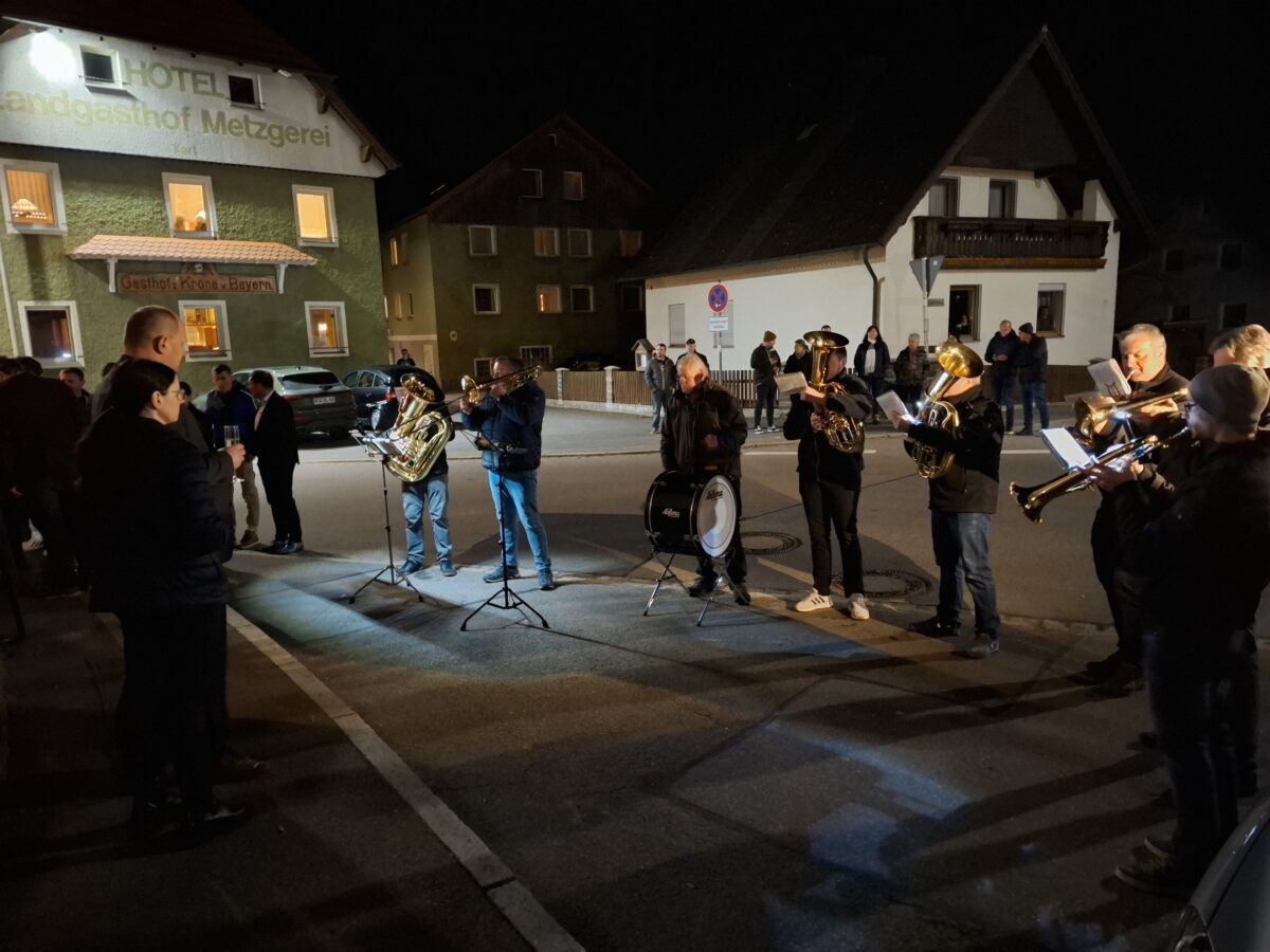 Für eine besondere Überraschung sorgte eine Gruppe von Musikern der Schlossberger, die dem Wahlsieger ein musikalisches Ständchen brachten. Gespielt wurden unter anderem die Märsche Heimatland, Ruetz, Felsenfest und Bayernhymne. Thomas Kleber bedankte sich für den großen Vertrauensbeweis der Bevölkerung und erklärte: „Ich werde Bürgermeister für alle Bürgerinnen und Bürger sein.“ Sein erstes „Führungszeichen“ setzte der neue Bürgermeister gleich selbst – als Dirigent der Kapelle.