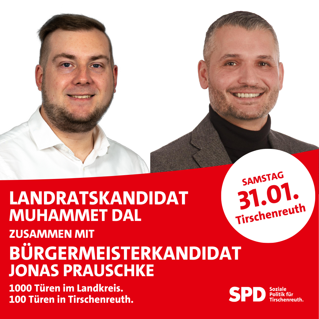 Am Samstag macht der SPD-Landratskandidat Muhammet Mo Dal mit seiner Aktion „1000-Türen im Landkreis“ Station in der Kreisstadt. Dort haben sich Dal und der Tirschenreuther SPD-Bürgermeisterkandidat Jonas Prauschke 100 Haustüren zum Ziel gesetzt.