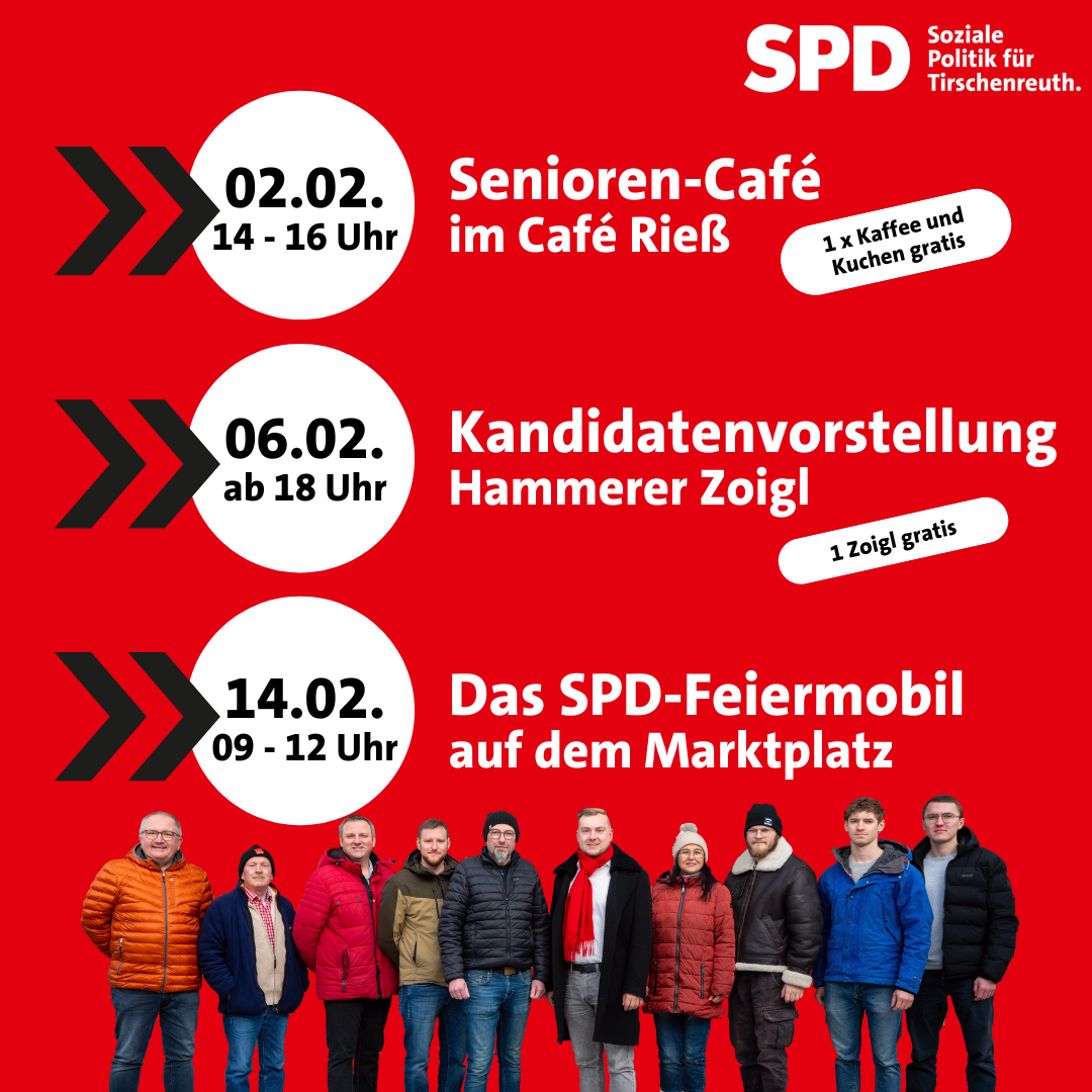 „Auf zum Hammerer-Zoigl“ heißt es am Freitag, 6. Februar, ab 18 Uhr. Dort werden sich die Kandidatinnen und Kandidaten der gemeinsamen Liste vorstellen. Am Samstag schließlich macht das „SPD-Feiermobil“ von 9 bis 12 Uhr Station auf dem Tirschenreuther Marktplatz. Auch hier erläutern die Kandidaten ihre Motivation und ihre Ziele für die Kreisstadt.