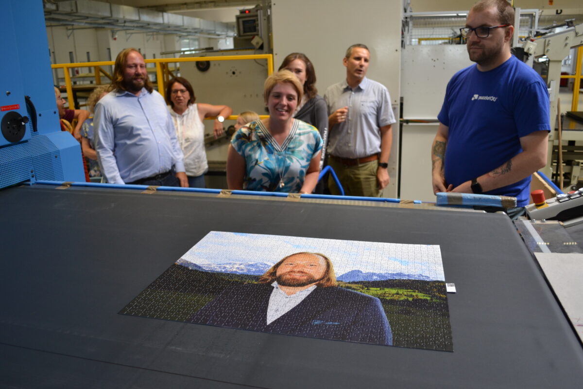 Zweite und letzte Station der Grünen-Exkursion war nach einer fast einstündigen Fahrt das tschechische Běla nad Radbuzou. Dort öffnete der Altenstädter Foto-Puzzle-Hersteller bereits 2010 eine zweite Produktionsstätte. Dr. Christian Schramek, puzzleYOU s.r.o.-Geschäftsführer, führte die Gäste durch den 40 Mitarbeiter großen Betrieb und überraschte Toni Hofreiter mit der Produktion eines eigens für ihn gefertigten Fotopuzzles. Als Erinnerung durfte er 15 Exemplare des Puzzles mit nach Hause nehmen. Im Mittelpunkt der Zusammenkunft aber stand der Austausch über die deutsch-tschechischen Beziehungen und mögliche Probleme bei der grenzüberschreitenden Zusammenarbeit.