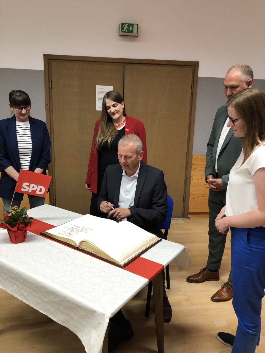 Zwischen den Rednern sorgte die Band Jara Milo mit Rockklassikern aus den 1970iger Jahren für beste Stimmung. Abschließend bedankte sich Vorsitzende Andrea Bertelshofer noch bei „Festleiter“ Manfred Klier für die Organisation. Es gab noch Glückwünsche und Geschenk vom Ortsverein Etzenricht dessen Paten die Manteler sind. Die SPD-Mitglieder versorgten die Gäste flott mit Getränken und auf den Tischen stand pikantes Kleingebäck. Zur Feier des Tages trugen sich dann die Ehrengäste in das Goldene Buch des Marktes Mantel ein.