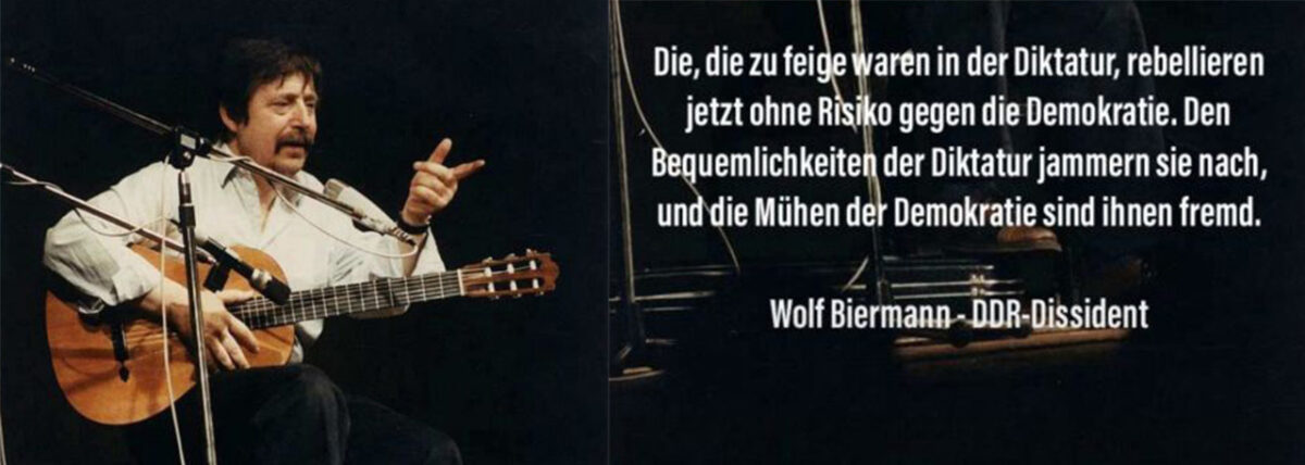Einen Kreis von klugen und mutigen Menschen, die mit dazu beitrugen, die DDR-Diktatur zu stürzen. Das genaue Gegenteil derjenigen, die ohne jedes Risiko durch das schöne Elbflorenz laufen, „wir sind das Volk“ grölen, und alle ausschließen, die anders denken. „Die, die zu feige waren in der Diktatur, rebellieren jetzt ohne Risiko gegen die Demokratie“, sagt Wolf Biermann, den Honecker als Staatsfeind Nummer 1 hinterrücks ausbürgern ließ. „Den Bequemlichkeiten der Diktatur jammern sie nach, und die Mühen der Demokratie sind ihnen fremd.“