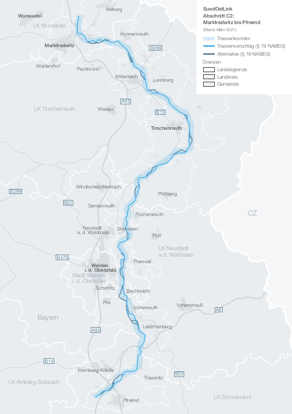 Acht Jahre später heißt das gebündelt Vorhaben “Südostlink”, die Leitungen sollen nun unterirdisch verlegt werden – doch Politiker, Bürgerinitiativen, Landwirte, Naturschützer und Grundbesitzer bilden nach wie vor eine breite Allianz gegen die Leitung im Allgemeinen (“Bürgerinitiative für eine dezentrale Energiewende und Klimaschutz statt überdimensioniertem Trassenbau”) beziehungsweise gegen den Trassenverlauf und deren Dimension im Speziellen (unter anderem Neustadts Landrat Andreas Meier und Weidens Oberbürgermeister Jens Meyer).