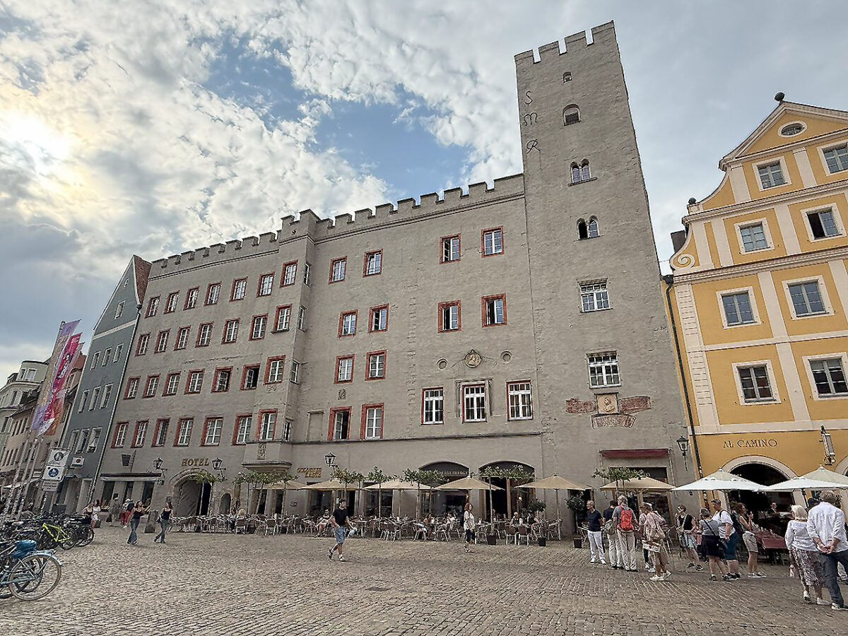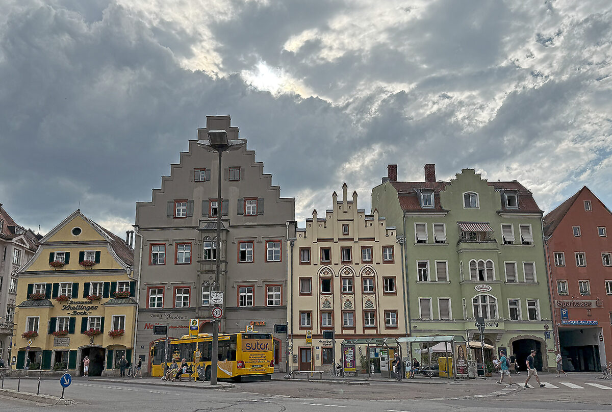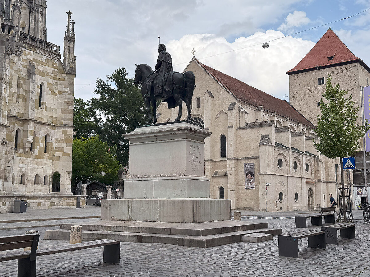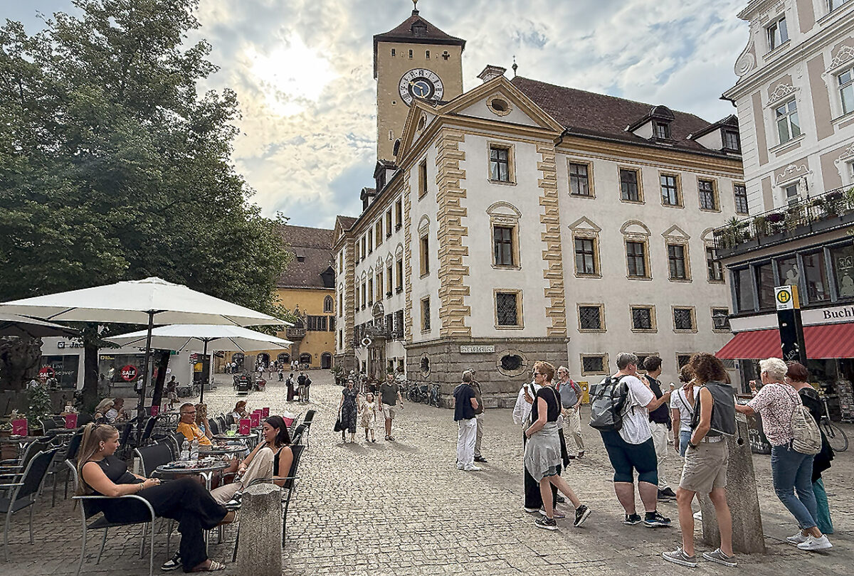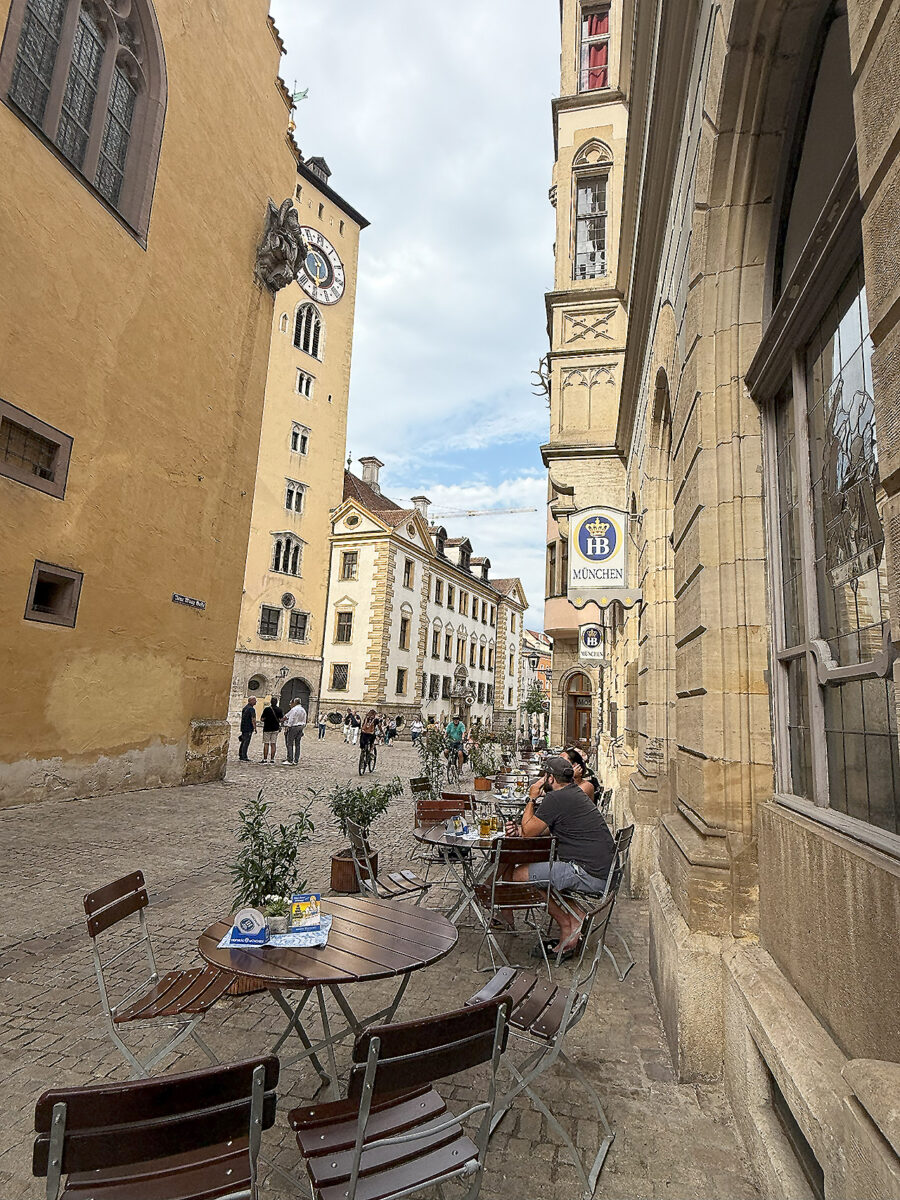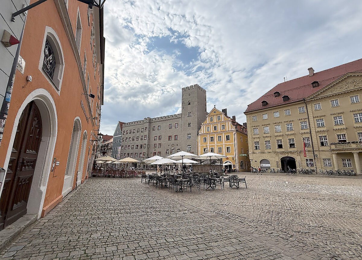 Über die Steinerne Brücke, auf deren sanierter Brüstung eine Replik des Bruckmandls den Baufortschritt des Doms beobachtet – nur der Legende nach ein Wettbewerb, der zum Freitod des Dombaumeisters führte – hinein ins Herz der Altstadt. Links fließt die Donau, rechts rollt die Erinnerung. Über dem Rathausportal thronen zwei steinerne Wächter: Schutz und Trutz – jahrzehntelang meine Kolumnenpaten für die Rundschau, wenn ich mich satirisch über städtische Verwerfungen mokierte – das Monstrum im Herzen der Altstadt, Generationen als Schocken, wie ihn meine Oma nannte, Merkur, Horten oder zuletzt Galerie Kaufhof geläufig.
