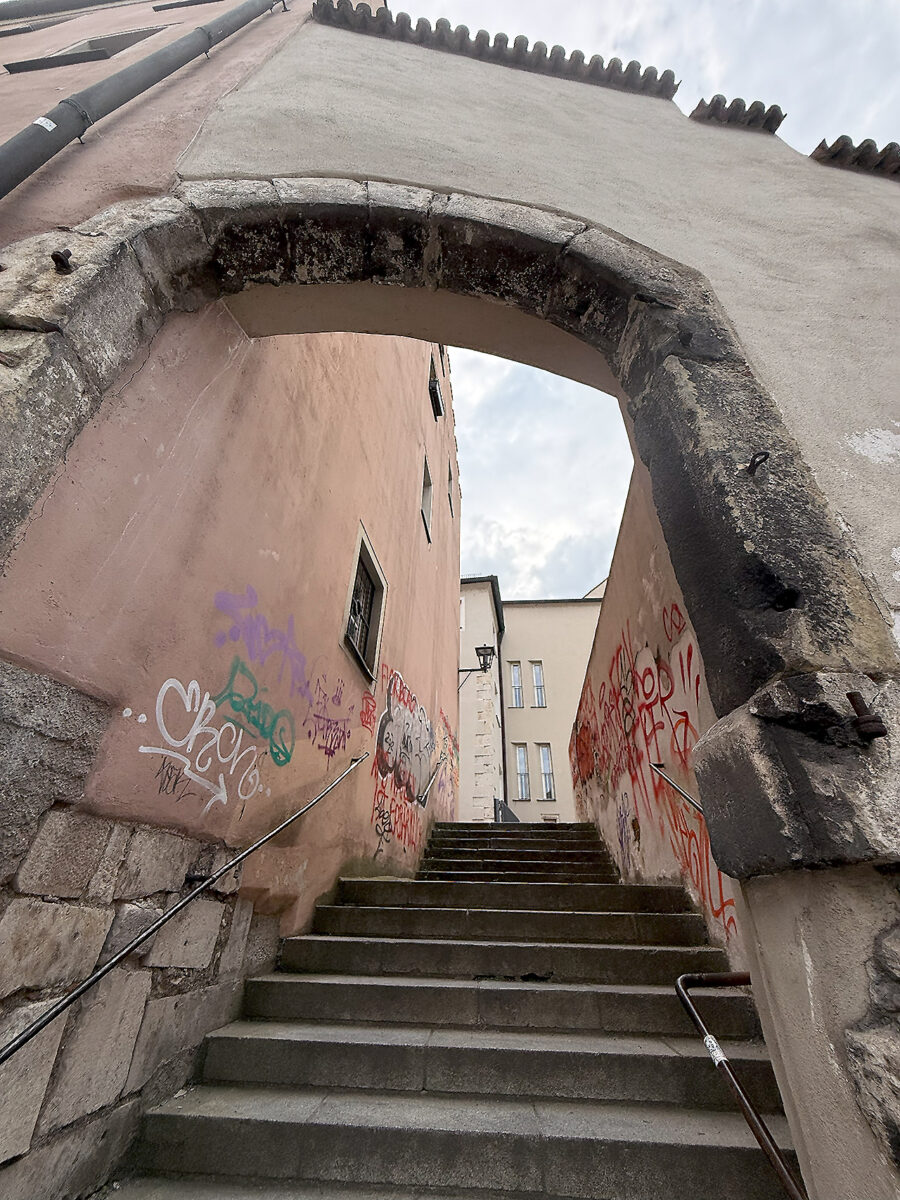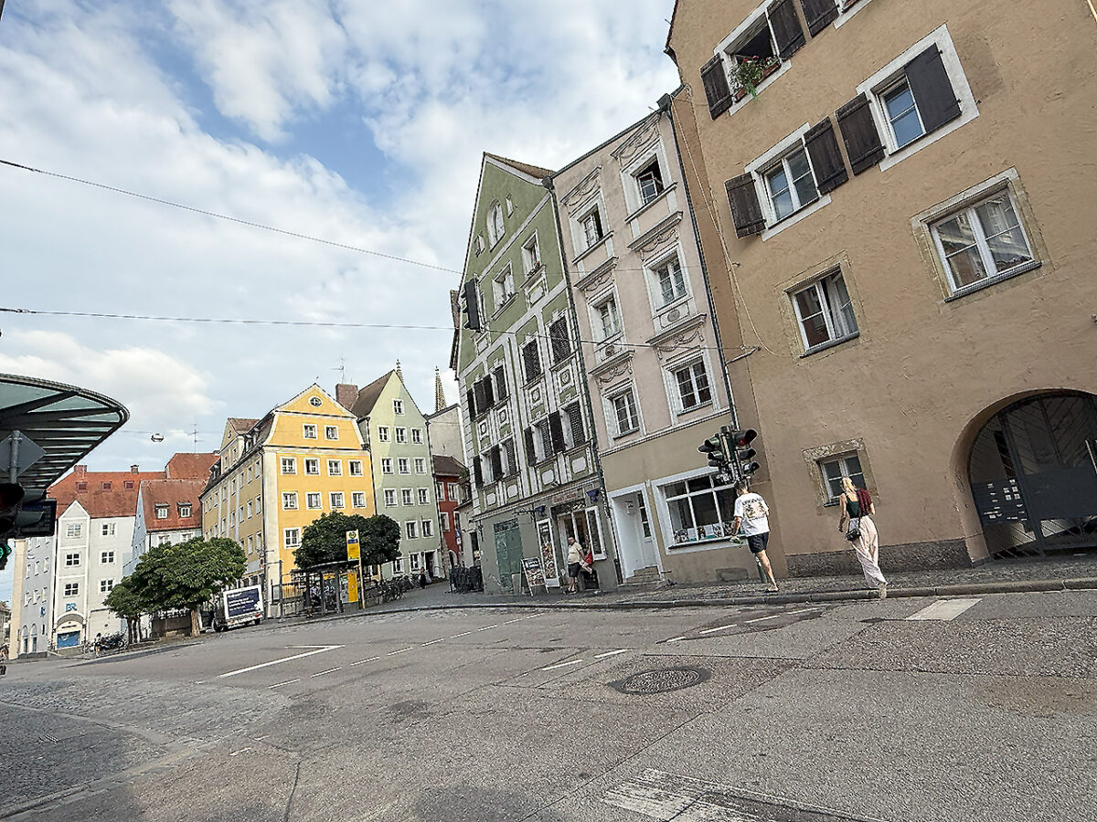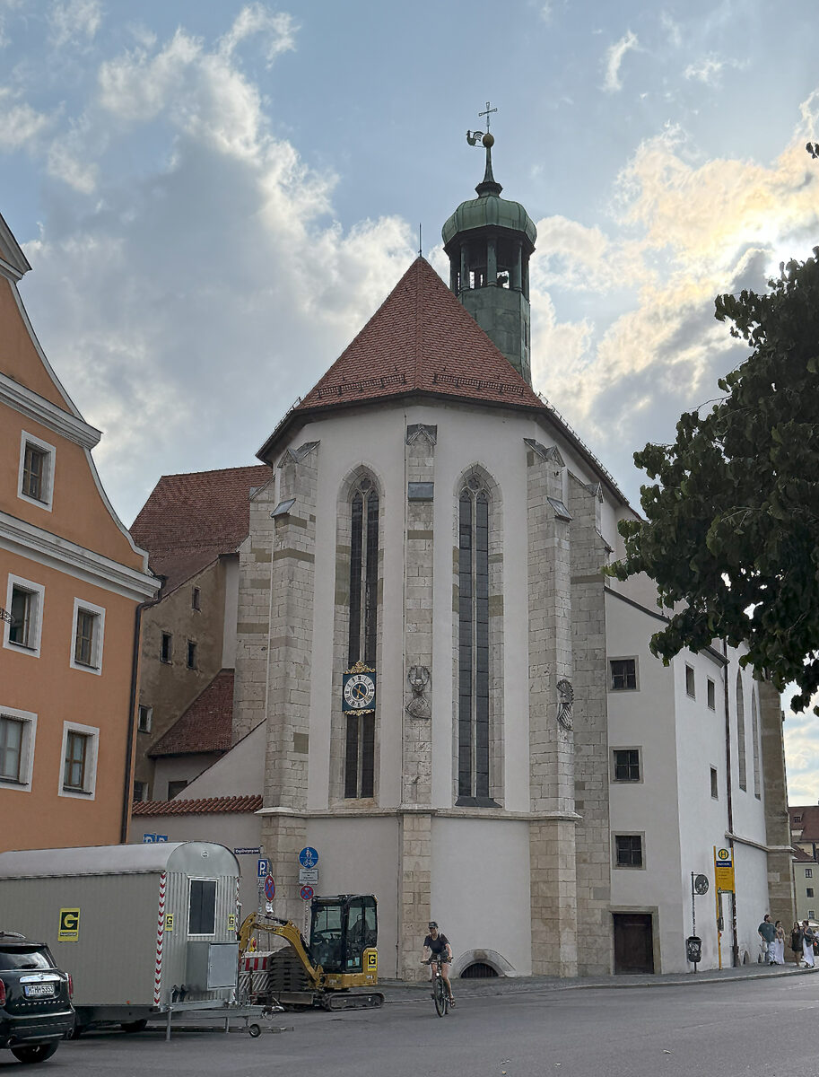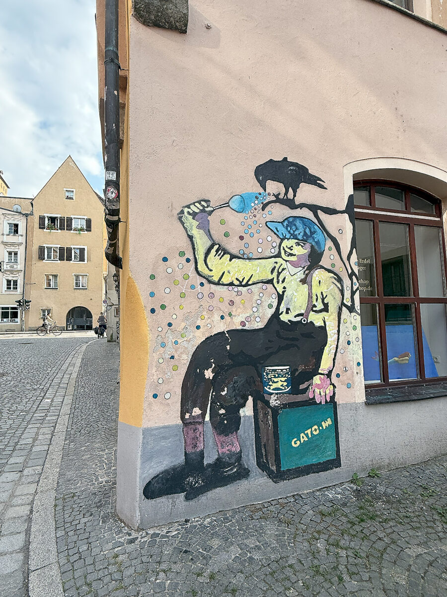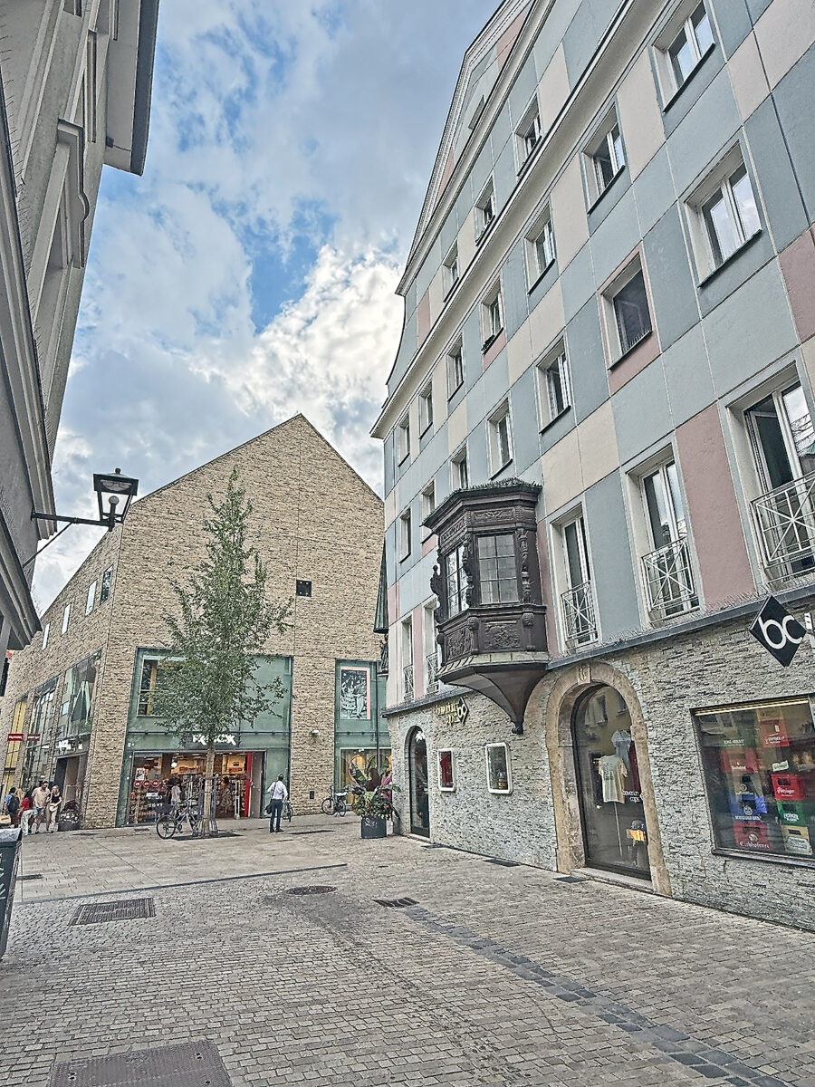 Über die Steinerne Brücke, auf deren sanierter Brüstung eine Replik des Bruckmandls den Baufortschritt des Doms beobachtet – nur der Legende nach ein Wettbewerb, der zum Freitod des Dombaumeisters führte – hinein ins Herz der Altstadt. Links fließt die Donau, rechts rollt die Erinnerung. Über dem Rathausportal thronen zwei steinerne Wächter: Schutz und Trutz – jahrzehntelang meine Kolumnenpaten für die Rundschau, wenn ich mich satirisch über städtische Verwerfungen mokierte – das Monstrum im Herzen der Altstadt, Generationen als Schocken, wie ihn meine Oma nannte, Merkur, Horten oder zuletzt Galerie Kaufhof geläufig.