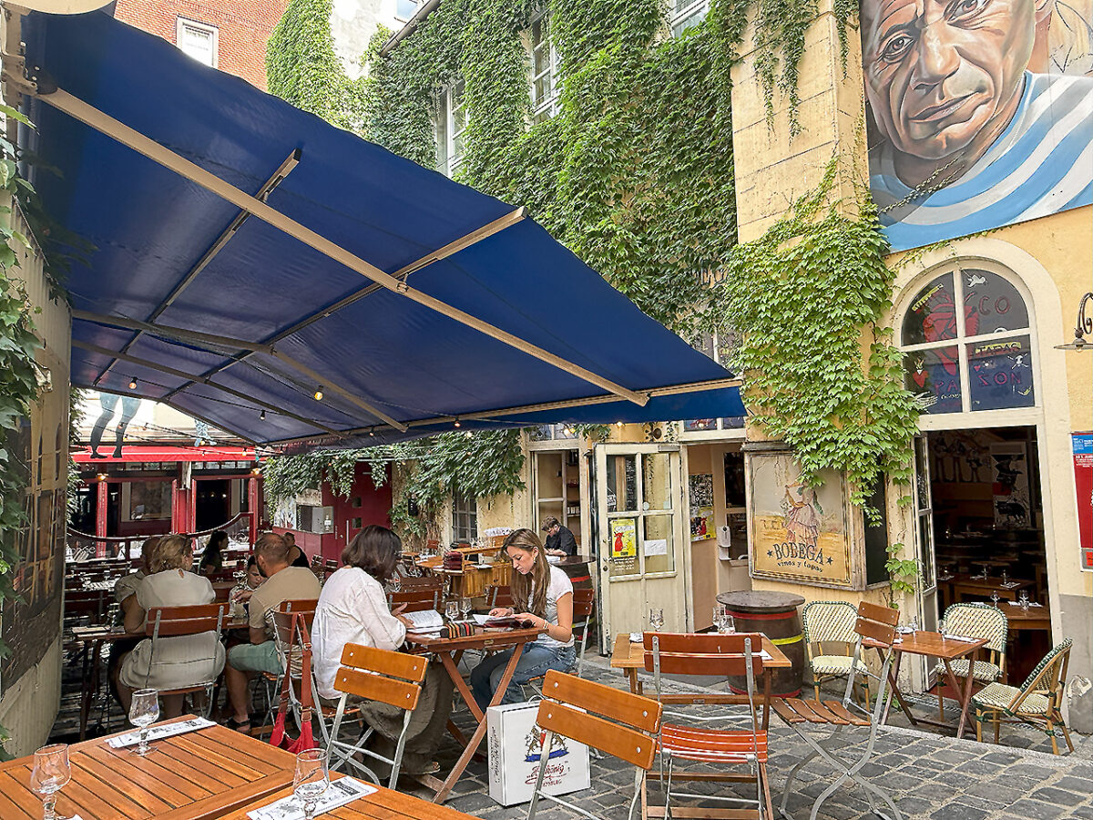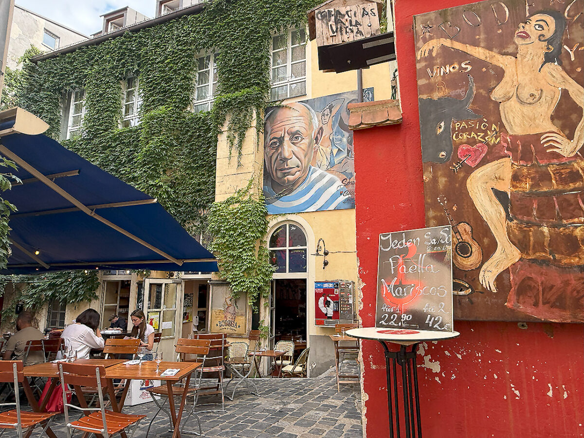 Wenige Gassen weiter werde ich für einige Augenblicke wieder Zaungast meines eigenen Entwicklungsromans. Im Restaurant Orphée in der Unteren Bachgasse 8, das originalste französische Bistro östlich des Rheins mit seinen roten Samtsesseln und Marmortischen im Bistro-Bereich, erst mein Wohnzimmer, dann mein Arbeitsplatz hinter der Theke in Studienzeiten – genauso wie in der Studentenkneipe Jenseits in der Glockengasse, das inzwischen genauso den Gang alles endlichen beschritt wie die René Benkos Kaufhaus-Ruine, und für dessen 25-Jahre-Sause ich Karikaturen ins Schaufenster hängte: „Ewig währt am längsten“ stand da leider historisch nicht ganz korrekt.